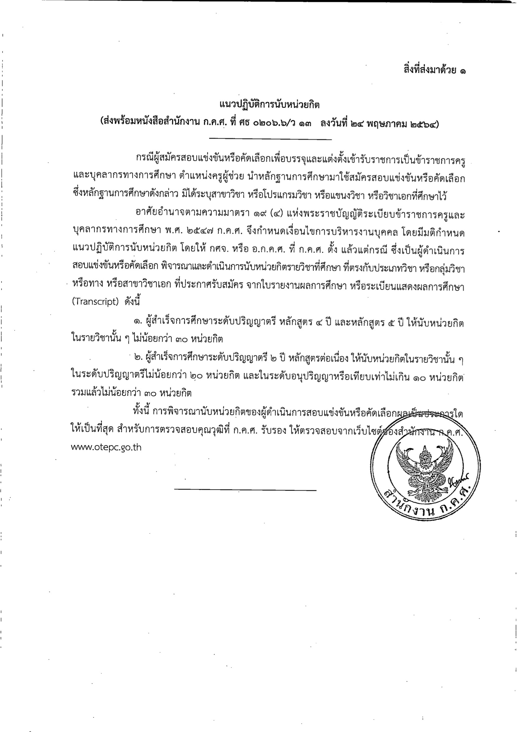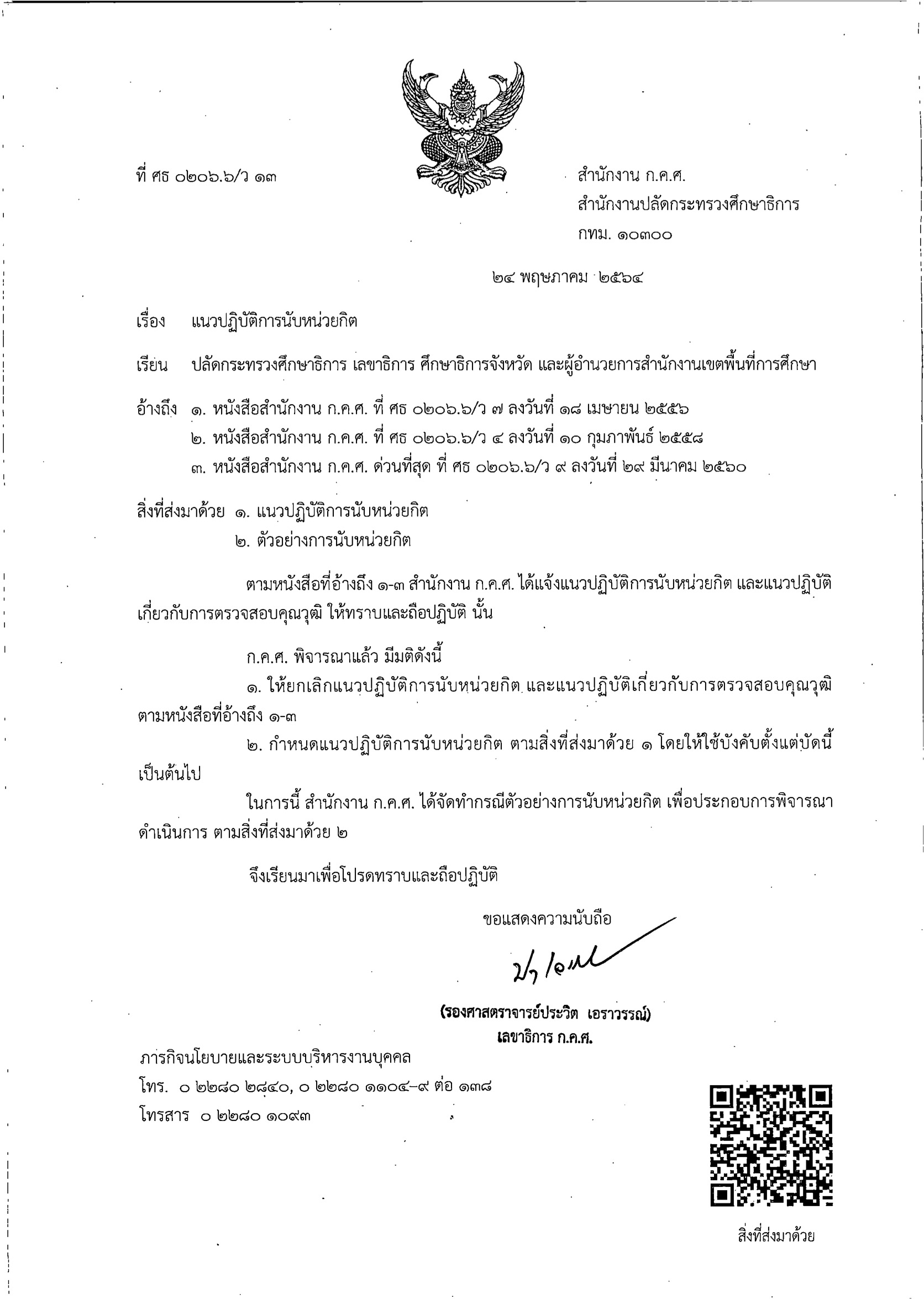 สำนักงานคณะกรรมการข้าราชการครูและบุคลากรทางการศึกษา (สำนักงาน ก.ค.ศ.) ได้มีหนังสือ ว13/2564 ลงวันที่ 24 พฤษภาคม 2564 เรื่อง แนวปฏิบัติการนับหน่วยกิต โดยมีรายละเอียด ดังนี้