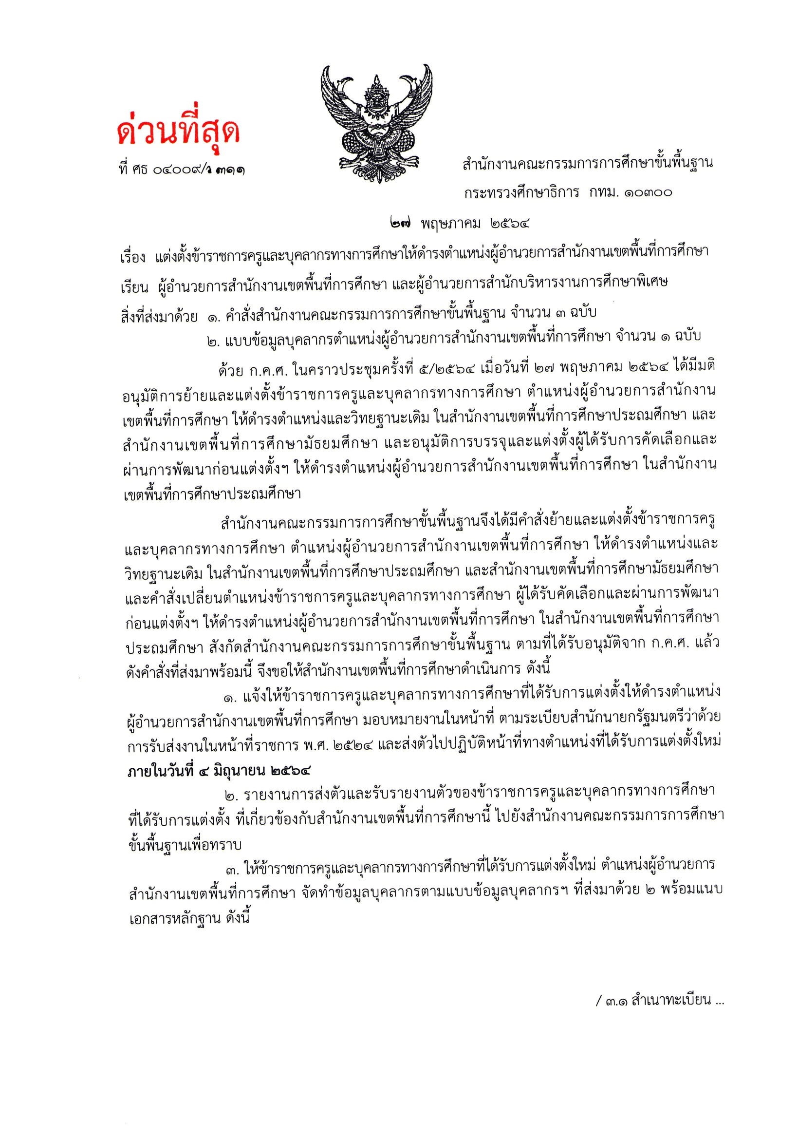 สำนักงานคณะกรรมการการศึกษาขั้นพื้นฐาน มีหนังสือ ด่วนที่สุด เรื่องแต่งตั้งข้าราชการครูและบุคลากรทางการศึกษาให้ดำรงตำแหน่งผู้อำนวยการสำนักงานเขตพื้นที่การศึกษา