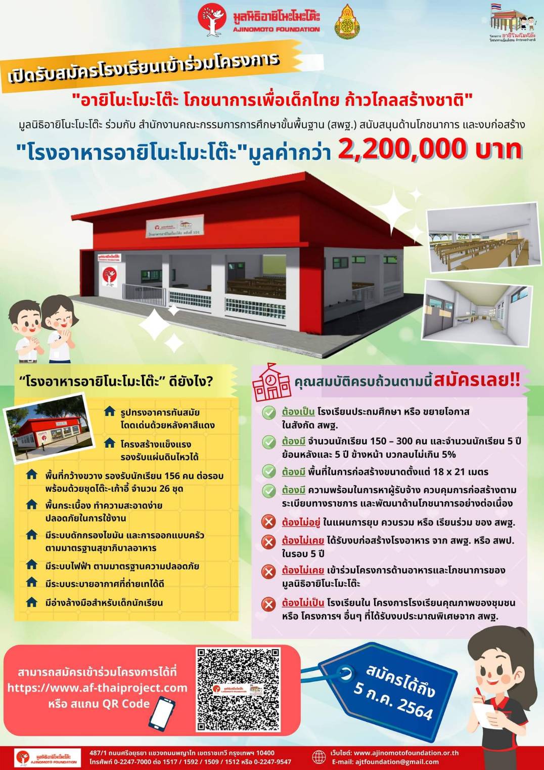 มูลนิธิอายิโนะโมะโต๊ะ รับสมัครโรงเรียนเข้าร่วมโครงการ “อายิโนะโมะโต๊ะ โภชนาการเพื่อเด็กไทย ก้าวไกลสร้างชาติ” เพื่อรับการสนับสนุนด้านโภชนาการและงบประมาณก่อสร้างโรงอาหาร มูลค่ากว่า 2,200,000 บาท ตั้งแต่บัดนี้จนถึงวันที่ 5 กรกฎาคม 2564