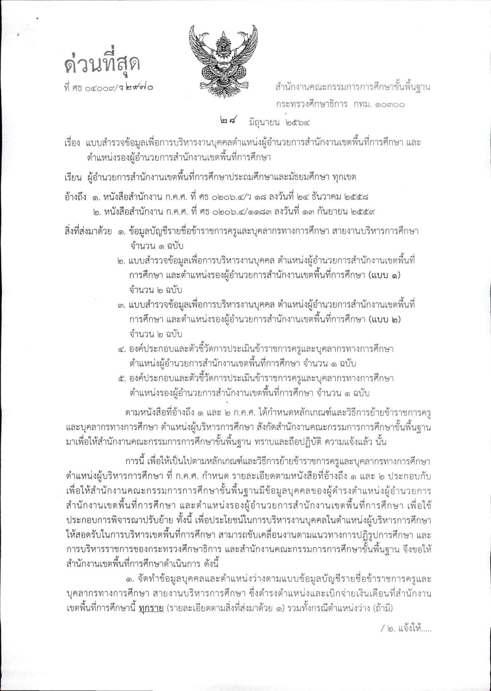 ด่วนที่สุด เรื่อง แบบสำรวจข้อมูลเพื่อการบริหารงานบุคคลตำแหน่งผู้อำนวยการสำนักงานเขตพื้นที่การศึกษา และตำแหน่งรองผู้อำนวยการสำนักงานเขตพื้นที่การศึกษา