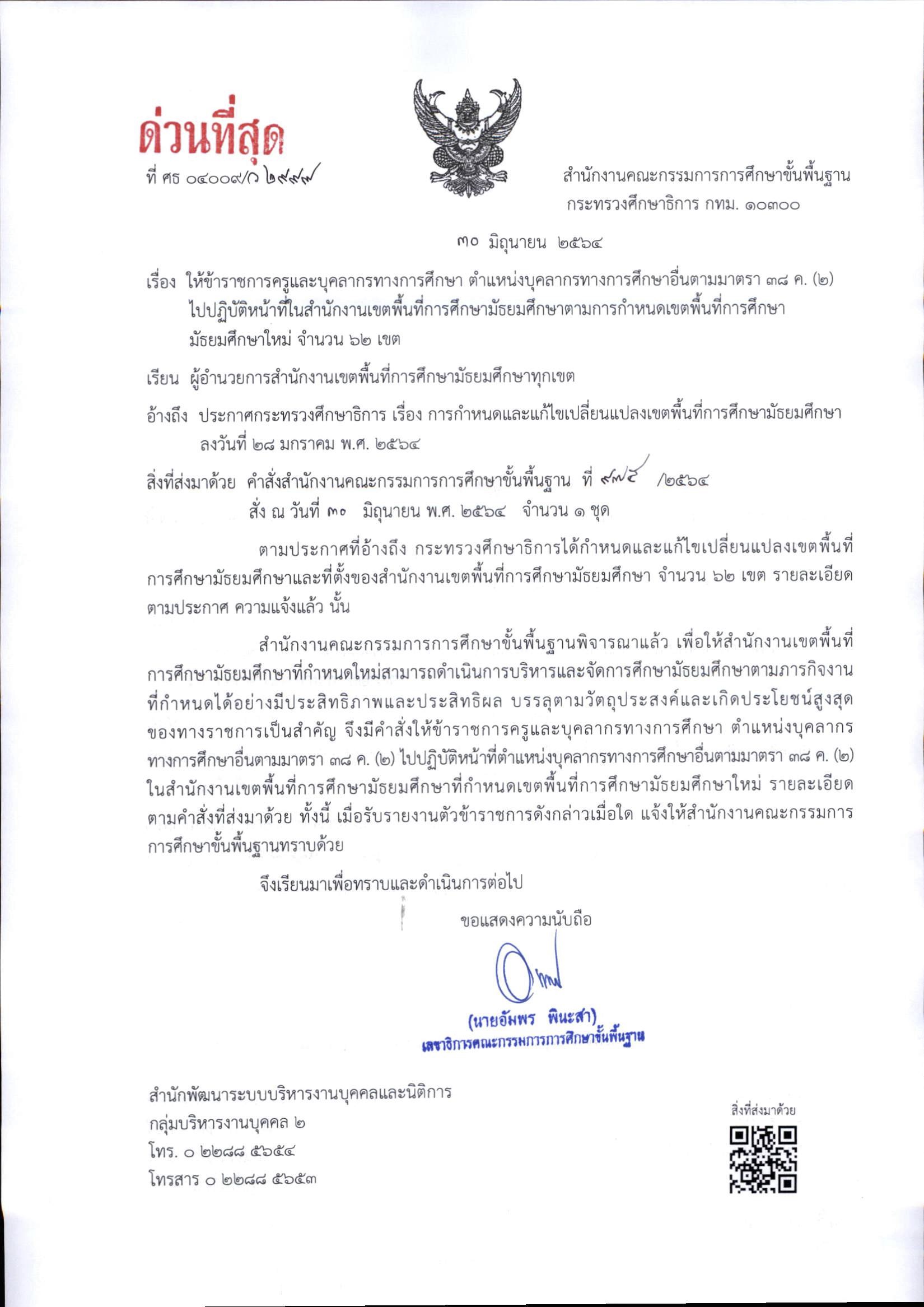 ด่วนที่สุด เรื่อง ให้ข้าราชการและบุคลากรทางการศึกษา ตำแหน่งบุคลากรทางการศึกษาอื่นตามมาตรา 38 ค. (2) ไปปฏิบัติหน้าที่ใน สพม. ตามการกำหนดเขตพื้นที่การศึกษามัธยมศึกษาใหม่ จำนวน 62 เขต