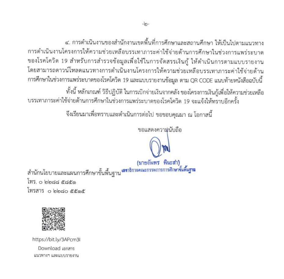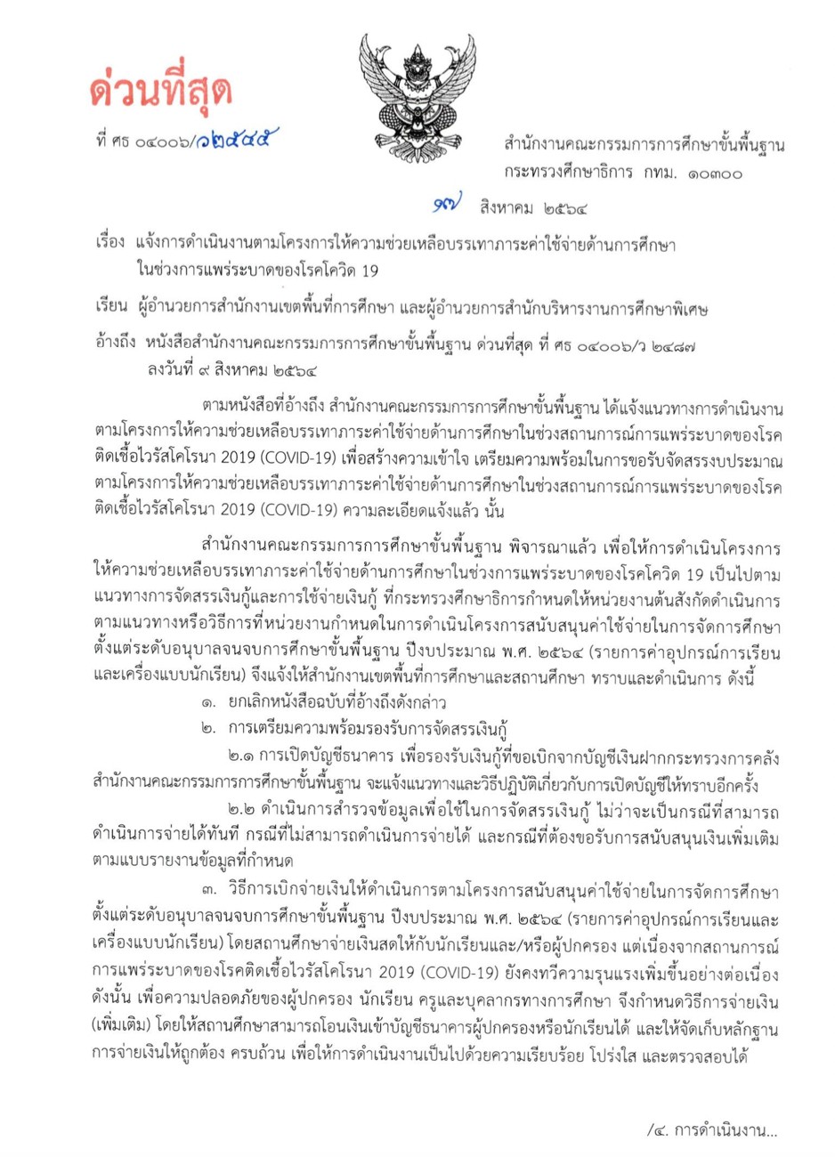 17 สิงหาคม 2564 สำนักงานคณะกรรมการการศึกษาขั้นพื้นฐาน มีหนังสือที่ ศธ 04006/ว2545 เรื่อง แจ้งการดำเนินงานตามโครงการให้ความช่วยเหลือบรรเทาภาระค่าใช้จ่ายด้านการศึกษา ในช่วงการแพร่ระบาดของโรคโควิด 19 โดยมีรายละเอียด ดังนี้