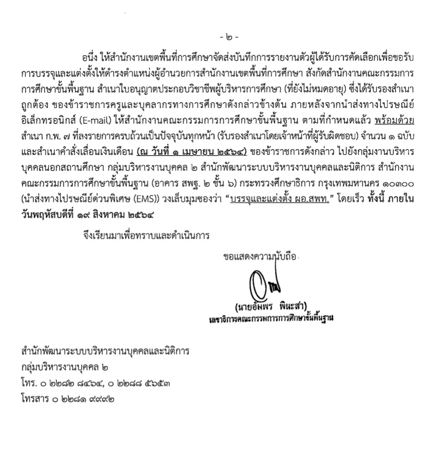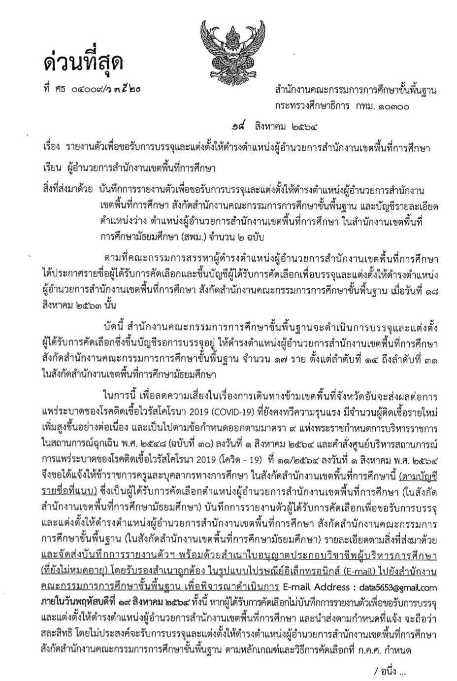 ด่วนที่สุด เรื่องรายงานตัวเพื่อขอรับการบรรจุและแต่งตั้งให้ดำรงตำแหน่งผู้อำนวยการสำนักงานเขตพื้นที่การศึกษา