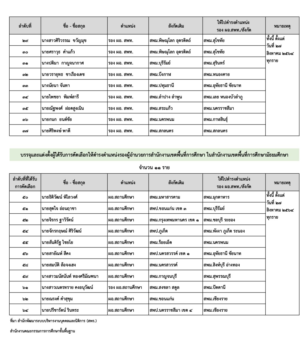 27 สิงหาคม 2564 : แต่งตั้งข้าราชการครูและบุคลากรทางการศึกษา ให้ดำรงตำแหน่งผู้อำนวยการสำนักงานเขตพื้นที่การศึกษา และตำแหน่งรองผู้อำนวยการสำนักงานเขตพื้นที่การศึกษา ในสำนักงานเขตพื้นที่การศึกษามัธยมศึกษา สังกัด สพฐ.