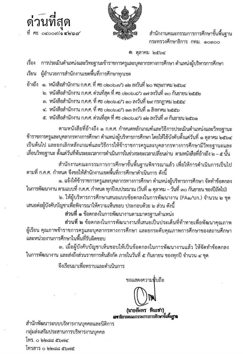 ด่วนที่สุด ที่ ศธ 04009/ว 4268 ลงวันที่ 1 ตุลาคม 2564 เรื่อง การประเมินตำแหน่งและวิทยฐานะข้าราชการครูและบุคลากรทางการศึกษา ตำแหน่งผู้บริหารการศึกษา