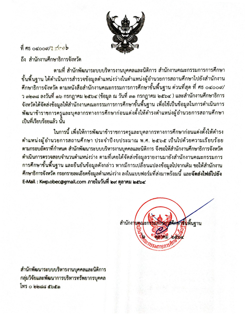 >>> ตรวจสอบตำแหน่งว่างเพื่อวางแผนจัดเตรียมการพัฒนาตำแหน่งผู้อำนวยการสถานศึกษา