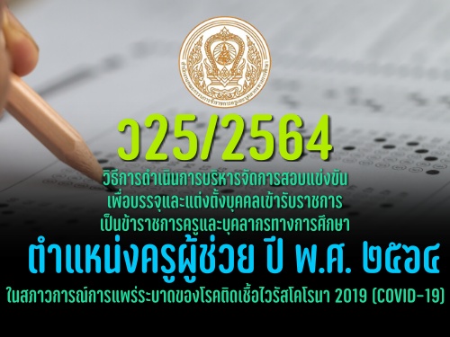 ว25/2564 วิธีการดำเนินการบริหารจัดการสอบแข่งขันเพื่อบรรจุและแต่งตั้งบุคคลเข้ารับราชการเป็นข้าราชการครูและบุคลากรทางการศึกษา ตำแหน่งครูผู้ช่วย ปี พ.ศ. ๒๕๖๔ ในสภาวการณ์การแพร่ระบาดของโรคติดเชื้อไวรัสโคโรนา 2019 (COVID-19)