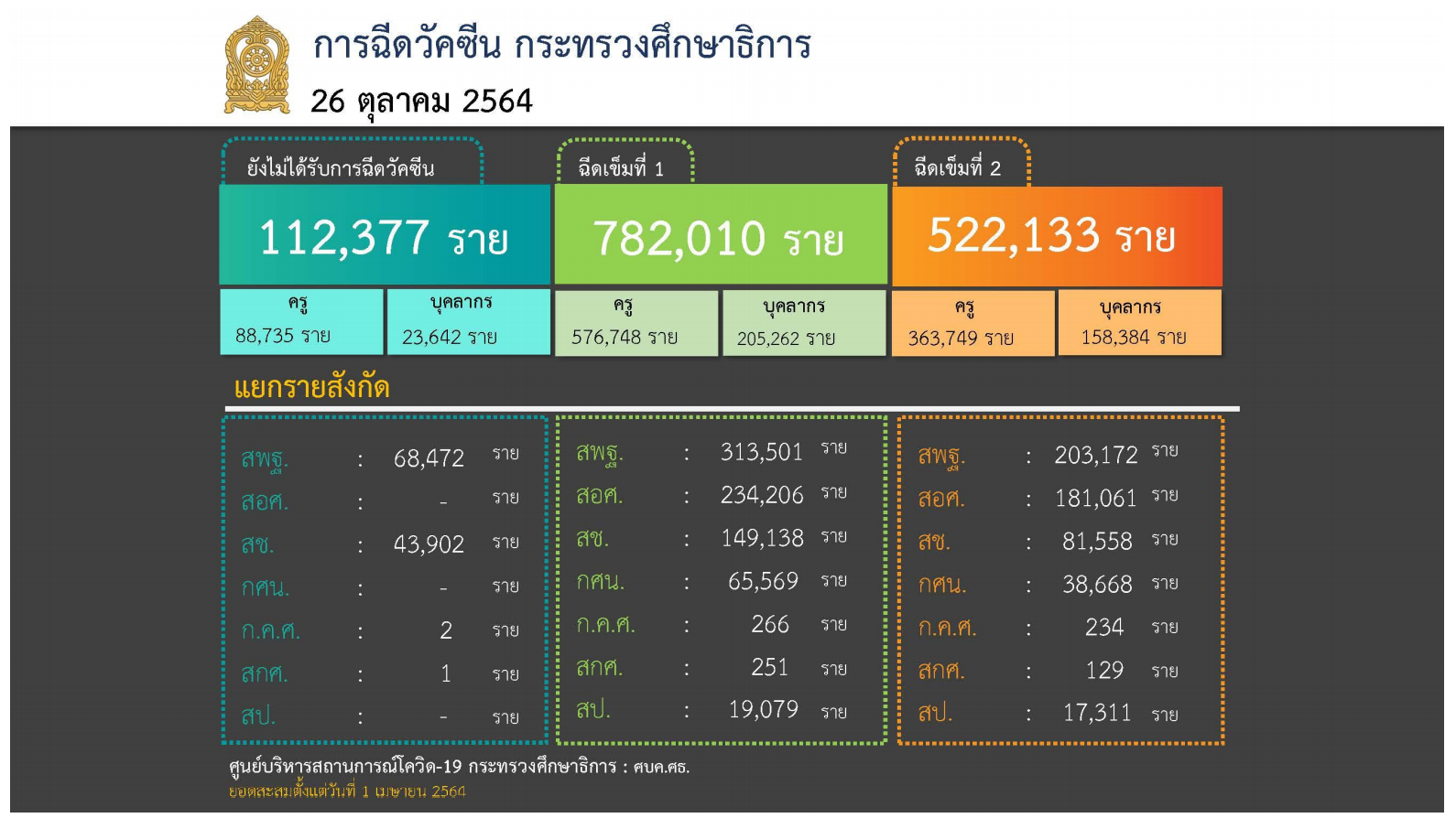 ดร.สุภัทร กล่าวว่า จากข้อมูลวันที่ 26 ต.ค.ที่ผ่านมา การฉีดวัคซีนให้ครูและบุคลากรทางการศึกษา ในสังกัด ศธ. มีดังนั้น ฉีดเข็มที่ 1 จำนวน 782,010 ราย แบ่งเป็น ครู 576,748 ราย บุคลากร 205,262 ราย ฉีดเข็มที่ 2 จำนวน 522,133 ราย แบ่งเป็น ครู 363,749 ราย บุคลากร 158,384 ราย ยังไม่ได้รับวัคซีน 112,377 ราย แบ่งเป็น ครู 88,735 ราย บุคลากร 23,642 ราย ส่วนภาพรวมจำนวนนักเรียนที่ฉีดวัคซีน จากข้อมูลวันที่ 27 ตุลาคม มีดังนี้ นักเรียนประสงค์ฉีดวัคซีน 3,817,727 ราย ฉีดวัคซีนแล้ว 2,544,267 ราย คิดเป็น 66.64%