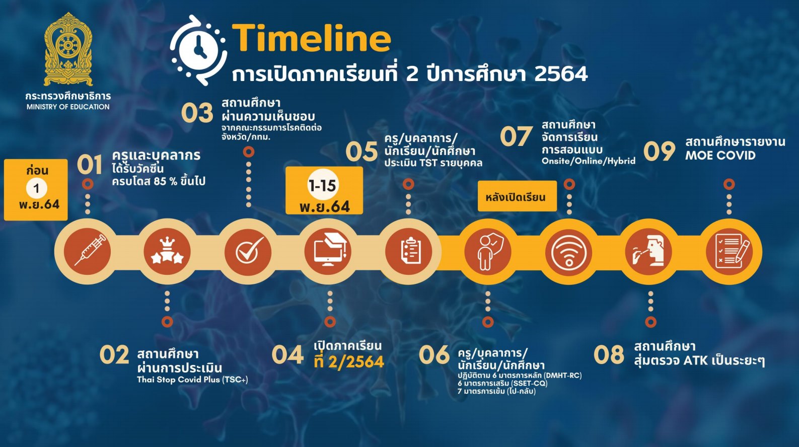 ทั้งนี้ ในการเปิดเรียนแบบ On Site โรงเรียน หรือ สถานศึกษาต้องผ่านการประเมินความพร้อมผ่าน Thai Stop Covid Plus (TSC+) และรายงานการติดตามการประเมินผลผ่าน MOECOVID โดยถือปฏิบัติอย่างเข้มข้น ต่อเนื่อง, ครูและบุคลากร ในพื้นที่ควบคุมสูงสุด (สีแดง) หรือ พื้นที่ควบคุมสูงสุดและเข้มงวด (สีแดงเข้ม) ต้องได้รับการฉีดวัคซีนครบ 2 เข็ม ร้อยละ 85 ขึ้นไป สำหรับครูและบุคลากรในพื้นที่อื่น ๆ ต้องได้รับวัคซีนเข็มที่ 1 ร้อยละ 85 ขึ้นไป ส่วนนักเรียนไม่มีกำหนด แต่ ศธ.ได้รณรงค์ทำความเข้าใจให้นักเรียนเข้ารับการฉีดวัคซีนมากที่สุด เพื่อความปลอดภัยของนักเรียนและผู้ปกครอง