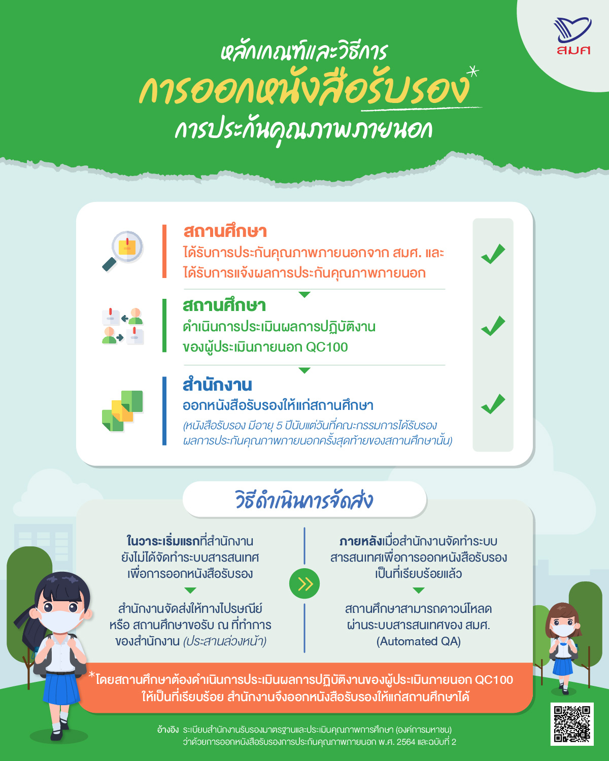 *สถานศึกษาต้องทำการประเมินในระบบติดตามประเมินผลการปฏิบัติงานของผู้ประเมินภายนอก (QC100) ให้เป็นที่เรียบร้อย สมศ. จึงออกหนังสือรับรองให้แก่สถานศึกษาได้