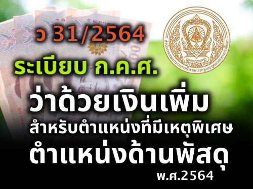 ว 31/2564 ระเบียบ ก.ค.ศ. ว่าด้วยเงินเพิ่มสำหรับตำแหน่งที่มีเหตุพิเศษ ตำแหน่งด้านพัสดุ พ.ศ.2564