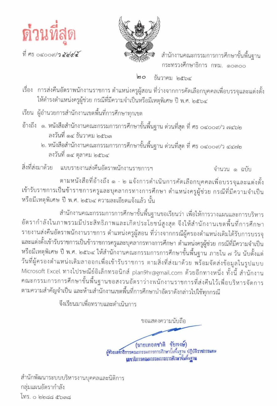 ด่วนที่สุด ที่ ศธ 04009/ว5995 การส่งคืนอัตราพนักงานราชการ ตำแหน่งครูผู้สอน ที่ว่างจากการคัดเลือกบุคคลเพื่อบรรจุและแต่งตั้งให้ดำรงตำแหน่งครูผู้ช่วย กรณีที่มีความจำเป็นหรือมีเหตุพิเศษ ปี พ.ศ. 2564 (ลงวันที่ 20 ธ.ค. 2564)