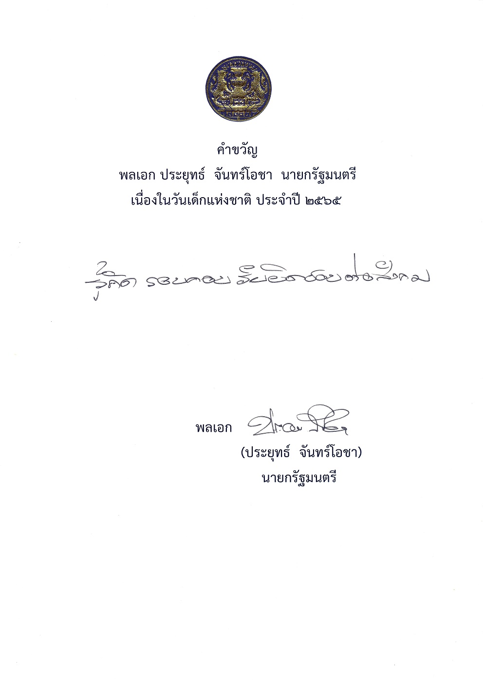 สำหรับคำขวัญวันเด็ก ประจำปี 2565 ซึ่งเป็นคำขวัญที่นายกรัฐมนตรีมอบให้เด็กไทย เนื่องในโอกาสวันเด็กแห่งชาติ ของทุกปี โดยในปีนี้ พลเอก ประยุทธ์ จันทร์โอชา นายกรัฐมนตรี ได้มอบคำขวัญเนื่องใน วันเด็กแห่งชาติ ประจำปี 2565ความว่า