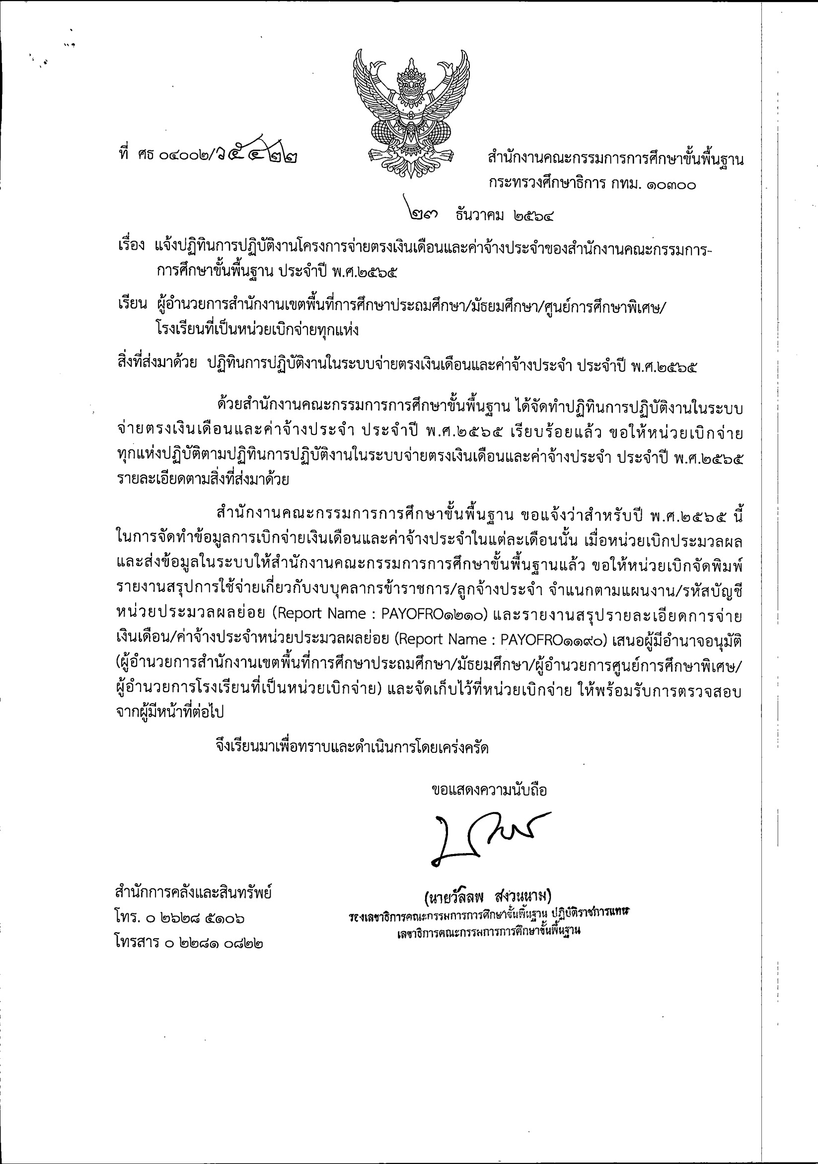 ที่ ศธ 04002/ว5422 ลงวันที่ 23 ธันวาคม 2564 เรื่อง แจ้งปฏิทินการปฏิบัติงานโครงการจ่ายตรงเงินเดือนและค่าจ้างประจำของ สพฐ. ประจำปี พ.ศ.2565