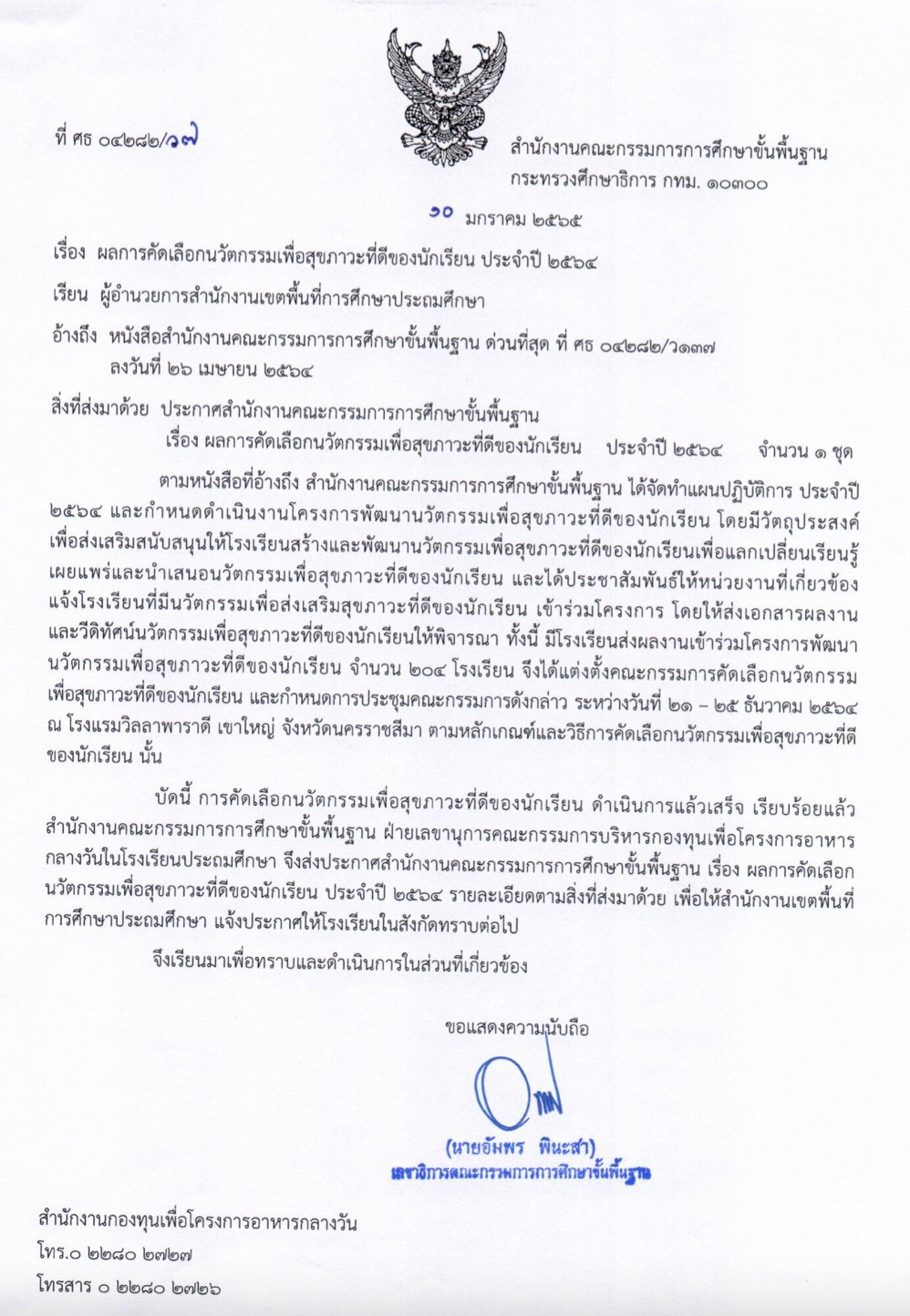 ประกาศผลการคัดเลือกนวัตกรรมเพื่อสุขภาวะที่ดีของนักเรียน ประจำปี 2564