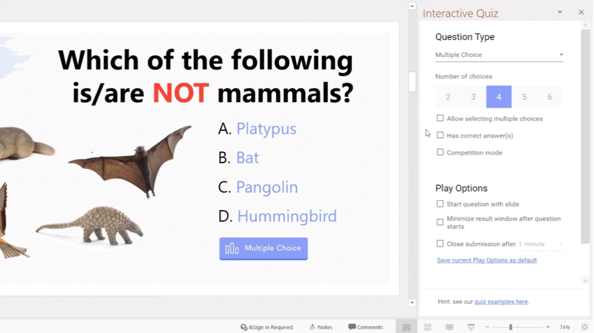 ในตัวอย่างมี 4 ตัวเลือกให้นักเรียนเลือก และมีคำตอบที่ถูกต้องหนึ่งข้อ อีกทั้งยังมีปากกาไวท์บอร์ดหลากหลายสี เพื่อให้คุณสามารถใส่คำอธิบายประกอบไว้บนสไลด์ PowerPoint ของคุณได้อย่างง่ายได้ด้วยการวาดหรือการเขียน