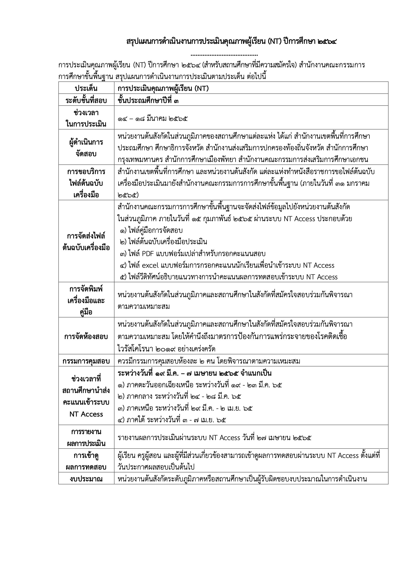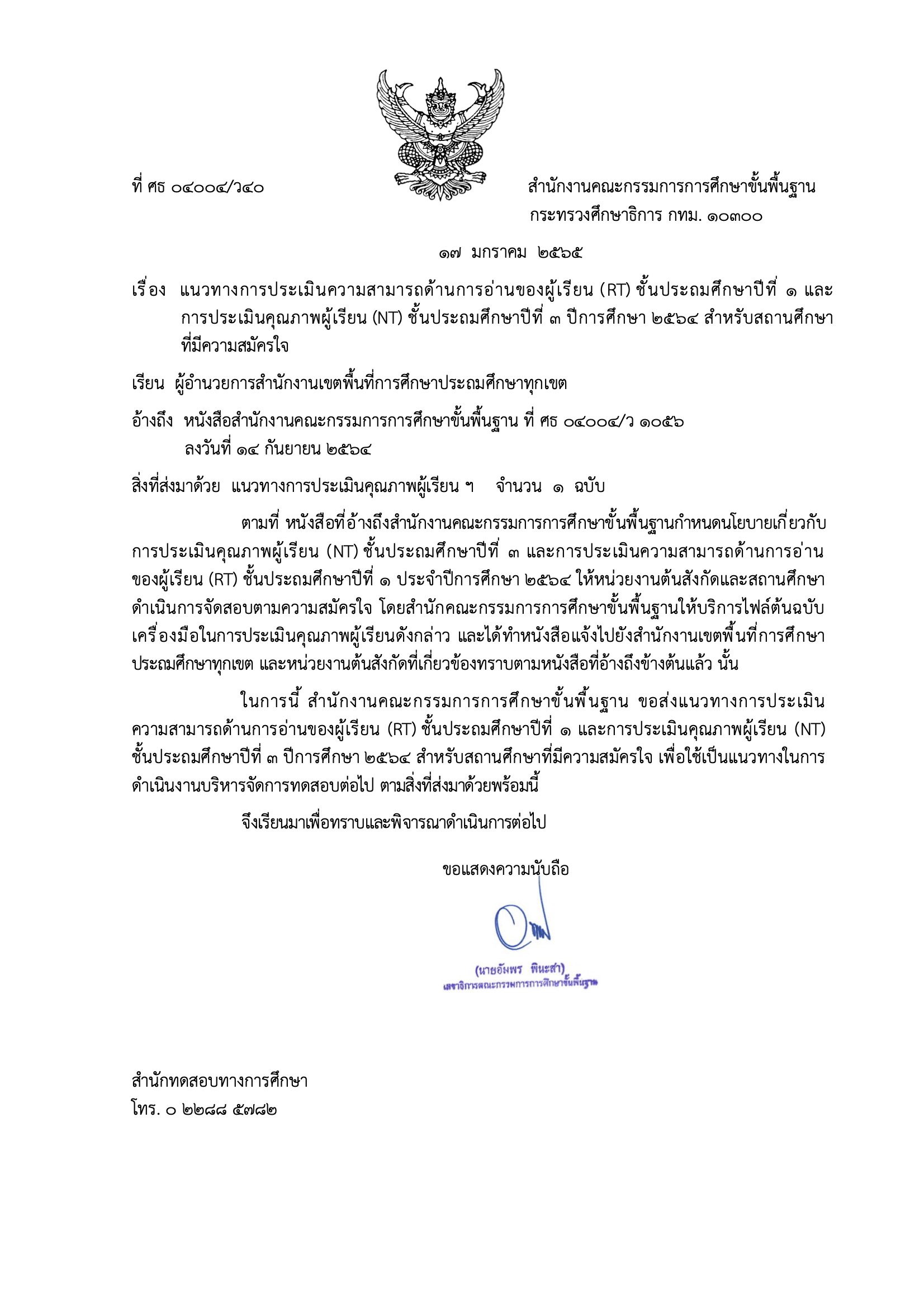 แนวทางการประเมินความสามารถด้านการอ่านของผู้เรียน (RT) ชั้นประถมศึกษาปีที่ 1 และ การประเมินคุณภาพผู้เรียน (NT) ชั้นประถมศึกษาปีที่ 3 ปีการศึกษา 2564 สำหรับสถานศึกษา ที่มีความสมัครใจ