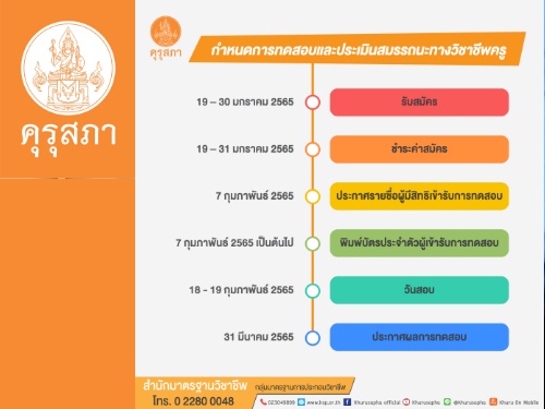 ตามที่สำนักงานเลขาธิการคุรุสภาได้ร่วมกับสถาบันทดสอบทางการศึกษาแห่งชาติ (องค์การมหาชน) หรือ สทศ. จัดทดสอบและประเมินสมรรถนะทางวิชาชีพครู ด้านความรู้และประสบการณ์วิชาชีพ ตามมาตรฐานวิชาชีพครู ประจำปี พ.ศ. 2565 ตามประกาศคณะกรรมการคุรุสภา เรื่อง กำหนดการทดสอบและประเมินสมรรถนะทางวิชาชีพครูฯ ประจำปี พ.ศ. 2565 โดยจัดการทดสอบฯ ครั้งที่ 1 ในวันที่ 18- 19 กุมภาพันธ์ 2565 นั้น ขณะนี้ สทศ.กำลังเปิดรับสมัครทดสอบและประเมินสมรรถนะทางวิชาชีพครู ฯ ผ่านระบบออนไลน์ทางเว็บไซต์ สทศ. https://www.niets.or.th/th/catalog/view/3985 และจะปิดรับสมัครวันที่ 30 มกราคม 2565 ทั้งนี้ผู้สมัครสามารถชำระค่าสมัครสอบถึงวันที่ 31 มกราคม 2565 ตามช่องทางและเงื่อนไขที่กำหนดตามประกาศสำนักงานเลขาธิการคุรุสภา เรื่อง ระบบ วิธีการ ขั้นตอน และเงื่อนไขในการลงทะเบียน บันทึกข้อมูล และสมัครเข้ารับการทดสอบและประเมินสมรรถนะทางวิชาชีพครูฯ ครั้งที่ 1 ประจำปี พ.ศ. 2565 อย่างไรก็ตามสำนักงานเลขาธิการคุรุสภา ขอย้ำผู้สมัครเมื่อสมัครแล้วอย่าลืมชำระเงิน เพื่อความสมบูรณ์ในการสมัครสอบ