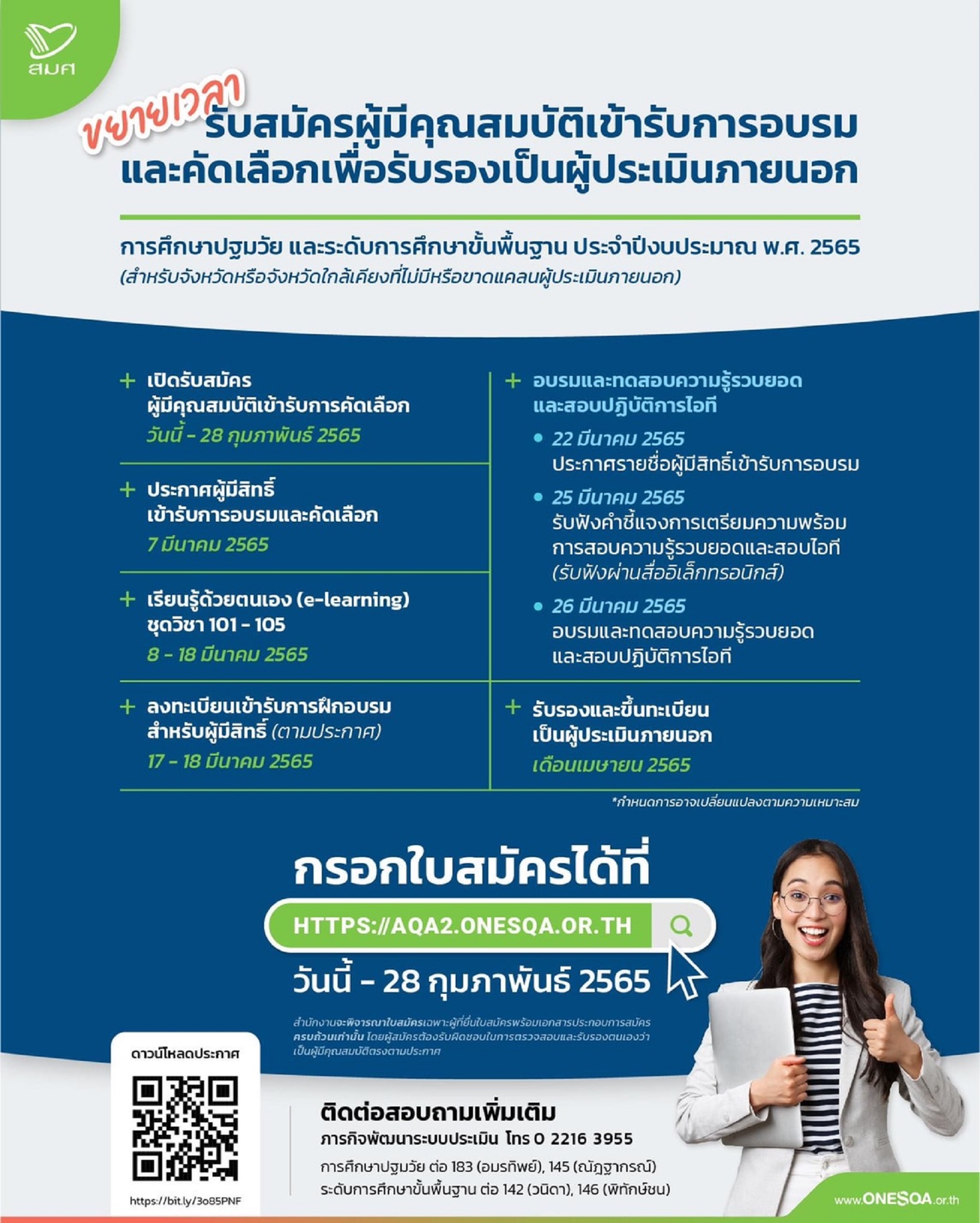 สำนักงานรับรองมาตรฐานและประเมินคุณภาพการศึกษา (สมศ.) ขยายเวลาเปิดรับสมัคร ผู้มีคุณสมบัติเข้ารับการอบรมและคัดเลือกเพื่อรับรองเป็นผู้ประเมินภายนอกการศึกษาปฐมวัยและการศึกษาขั้นพื้นฐาน ประจำปีงบประมาณ 2565 (เฉพาะจังหวัดที่ไม่มีหรือขาดแคลนผู้ประเมินภายนอก) แบ่งเป็นระดับการศึกษาปฐมวัย 120 คน และระดับการศึกษาขั้นพื้นฐาน 303 คน โดยผู้สมัครต้องมีการศึกษาไม่ต่ำกว่าระดับปริญญาตรี และอาศัยอยู่ในจังหวัดที่ขาดแคลนผู้ประเมินภายนอก หรือในพื้นที่จังหวัดใกล้เคียงกับจังหวัดที่ขาดแคลนผู้ประเมินภายนอก