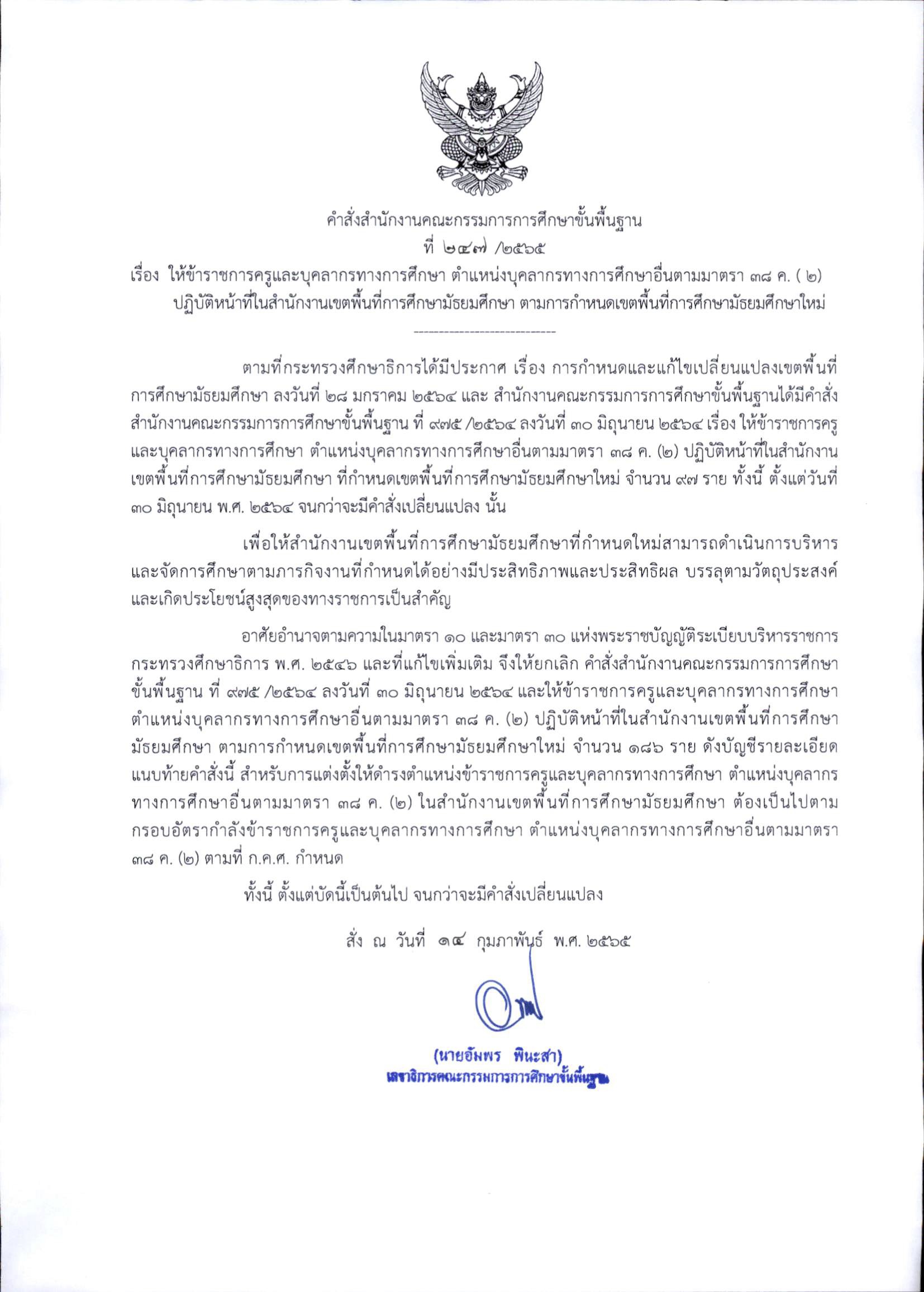 คำสั่ง สพฐ.ที่ 247/2565 ลงวันที่ 14 กุมภาพันธ์ 2565 เรื่อง ให้ข้าราชการครูฯ 38 ค.(2) ปฏิบัติหน้าที่ใน สพม. ตามกำหนดเขตพื้นที่ สพม.ใหม่ 20 เขต