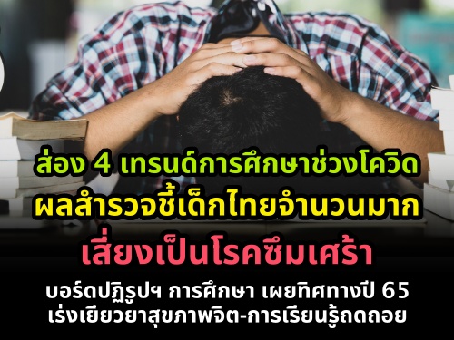การเรียนออนไลน์ผ่านหน้าจอเป็นเวลานานในสภาพแวดล้อมที่ไม่เอื้ออำนวยต่อการเรียนรู้ ไม่เพียงแต่สร้างความเบื่อหน่ายและทำให้ผลการเรียนของเด็กนักเรียนแย่ลง แต่ยังส่งผลในด้านอารมณ์และสังคม (Social-Emotion) เนื่องจากไม่ได้ออกไปใช้ชีวิตในสังคมอย่างที่ควรจะเป็นตามช่วงวัย ทำให้เด็กเกิดภาวะเครียด วิตกกังวล ไปจนถึงภาวะอารมณ์ดิ่ง นอกจากนี้ในเด็กกลุ่มเปราะบางยังต้องเผชิญกับปัญหาครอบครัว เช่น พ่อแม่ตกงาน พ่อแม่ติดโควิด ทำให้รู้สึกโดดเดี่ยว ส่งผลไปถึงพฤติกรรมที่เปลี่ยนแปลงไป เช่น การกิน การนอน หากปล่อยทิ้งไว้อาจทำให้เกิดความเสี่ยงมีอาการซึมเศร้า หรือเสี่ยงมีพฤติกรรมต่อต้านสังคมได้ สำหรับประเทศไทยในช่วงปี 2563 – 2564 ที่ผ่านมา ผลการประเมินสุขภาพจิตเด็กและวัยรุ่นไทยโดยกรมสุขภาพจิตพบว่า ร้อยละ 28 มีภาวะเครียดสูง ร้อยละ 32 มีความเสี่ยงที่จะเป็นโรคซึมเศร้าร้อยละ 22 มีความเสี่ยงที่จะฆ่าตัวตาย สะท้อนให้เห็นว่าเด็กไทยจำนวนมากกำลังเผชิญกับความเครียด ความกังวล และภาวะซึมเศร้าอย่างต่อเนื่อง เพราะฉะนั้นการสำรวจสภาพจิตใจของเด็กอยู่เสมอและการเยียวยาสุขภาพจิตใจของเด็กจึงเป็นเรื่องสำคัญอย่างยิ่ง โดยเฉพาะการจัดหานักจิตวิทยาโรงเรียนเพื่อคอยช่วยเหลือเด็กๆ ซึ่งประเทศไทยถือว่ายังมีจำนวนไม่เพียงพอเมื่อเทียบกับสัดส่วนของนักเรียน