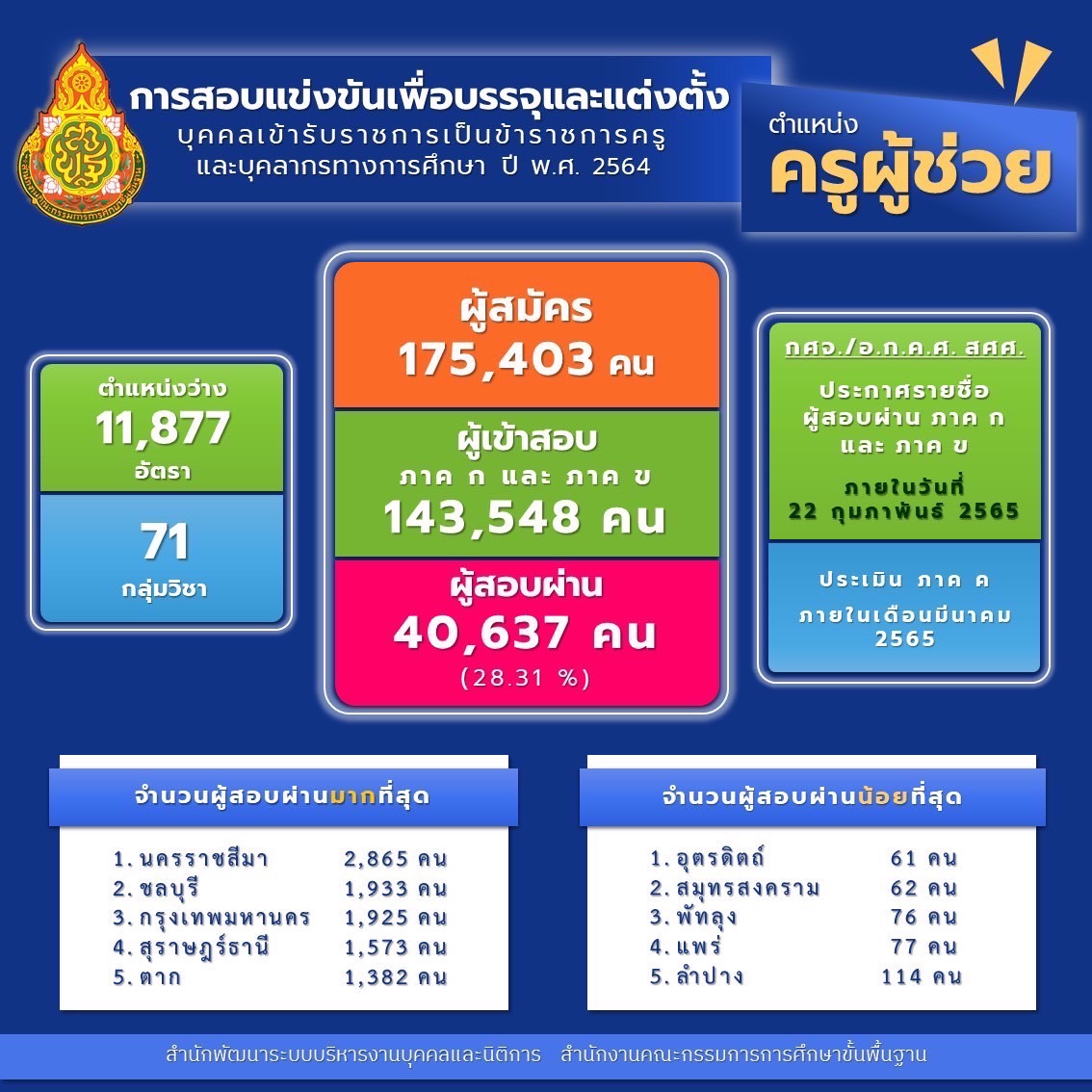 เมื่อวันที่ 22 กุมภาพันธ์ 2565 ดร.อัมพร พินะสา เลขาธิการคณะกรรมการการศึกษาขั้นพื้นฐาน(กพฐ.) เปิดเผยว่า ตามที่สำนักงานคณะกรรมการการศึกษาขั้นพื้นฐาน(สพฐ.) ได้จัดสอบแข่งขันเพื่อบรรจุและแต่งตั้งบุคคลเข้ารับราชการเป็นข้าราชการครูและบุคลากรทางการศึกษา ปี พ.ศ.2564 ตำแหน่งครูผู้ช่วย ที่มีตำแหน่งว่าง 11,877 อัตรา 71 กลุ่มวิชา ซึ่งคณะกรรมการศึกษาธิการจังหวัด(กศจ.) / คณะอนุกรรมการข้าราชการครูและบุคลากรทางการศึกษา(อ.ก.ค.ศ.) สำนักบริหารงานการศึกษาพิเศษ(สศศ.) ได้ดำเนินการจัดสอบภาค ก ความรู้ทั่วไปเมื่อวันที่ 5 กุมภาพันธ์ 2565 และ สอบภาค ข มาตรฐานความรู้และประสบการณ์วิชาชีพ วันที่ 6 กุมภาพันธ์ 2565 ที่ผ่านมา โดยมีผู้สมัครทั้งสิ้นจำนวน 175,403 คน เข้าสอบ ภาค ก และ ภาค ข จำนวน 143,548 คน ซึ่ง กศจ./อ.ก.ค.ศ. สศศ.ได้ประกาศรายชื่อผู้สอบผ่าน ภาค ก และ ภาค ข แล้ว โดยมีผู้สอบผ่านทั้งสิ้นจำนวน 40,737 คน คิดเป็น 28.31 % ของผู้เข้าสอบ และจะมีการประเมิน ภาค ค ความเหมาะสมกับตำแหน่ง วิชาชีพและการปฏิบัติงานในสถานศึกษา ภายในเดือน มีนาคม 2565