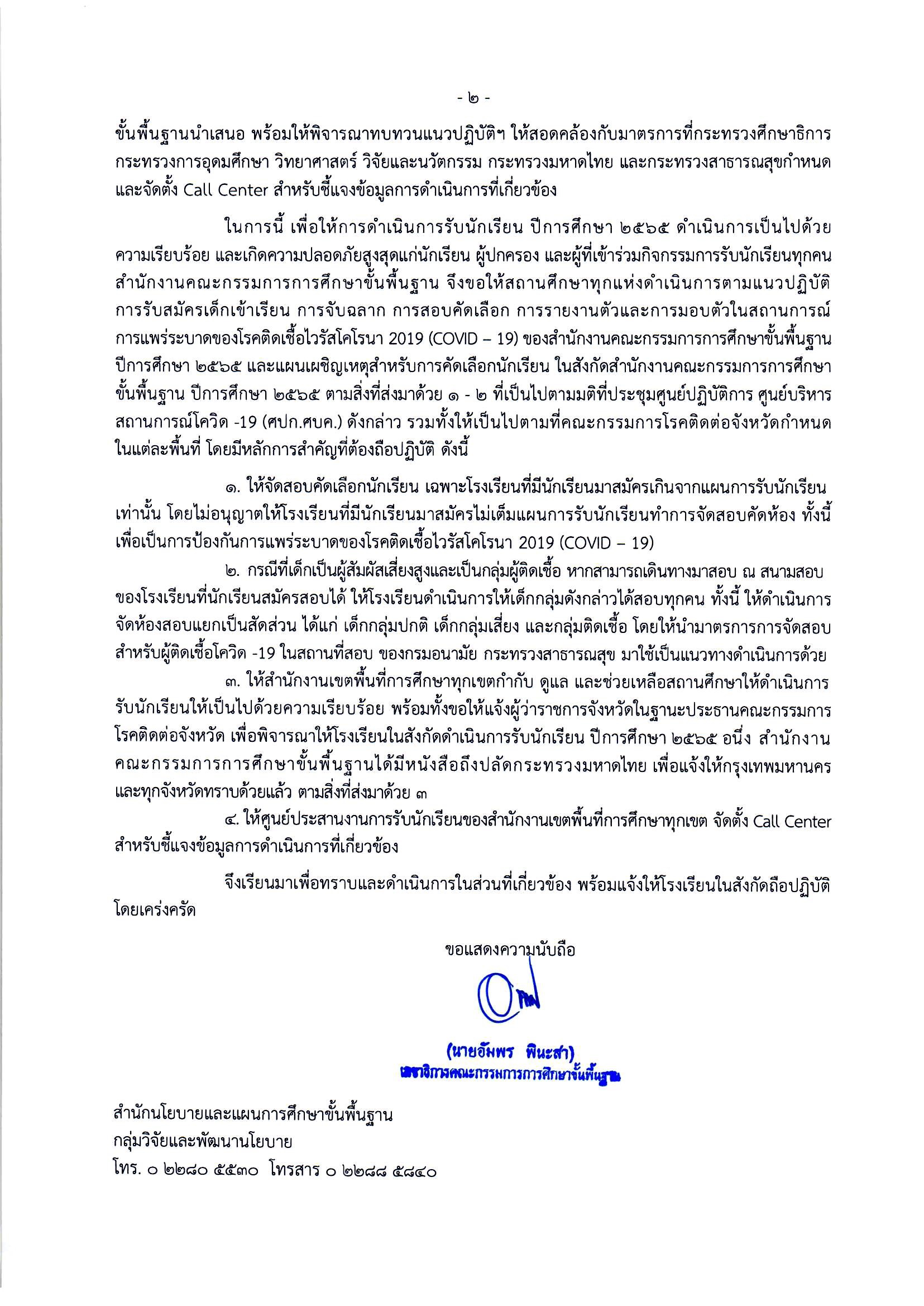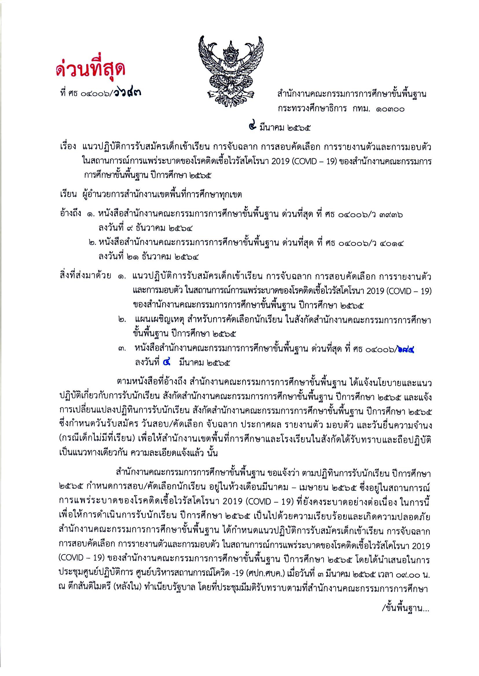 แนวปฏิบัติการรับสมัครเด็กเข้าเรียน การจับฉลาก การสอบคัดเลือก การรายงานตัวและการมอบตัวในสถานการณ์การแพร่ระบาดของโรคติดเชื้อไวรัสโคโรนา 2019 (COVD - 19) ของสำนักงานคณะกรรมการการศึกษาขั้นพื้นฐาน ปีการศึกษา ๒๕๖๕