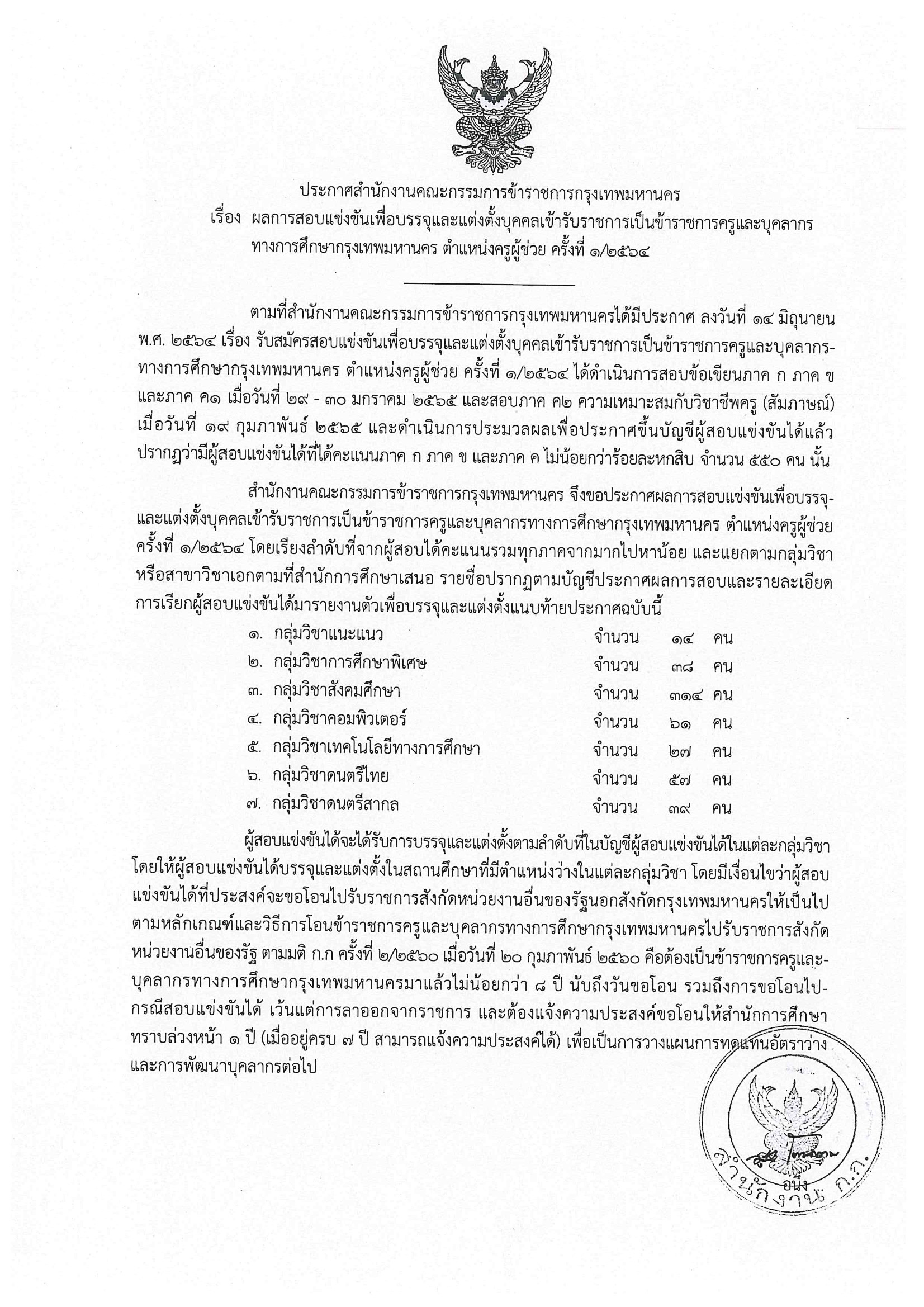 ประกาศผลการสอบแข่งขันเพื่อบรรจุและแต่งตั้งบุคคลเข้ารับราชการเป็นข้าราชการครูและบุคลากรทางการศึกษากรุงเทพมหานคร ตำแหน่งครูผู้ช่วย ครั้งที่ ๑/๒๕๖๔