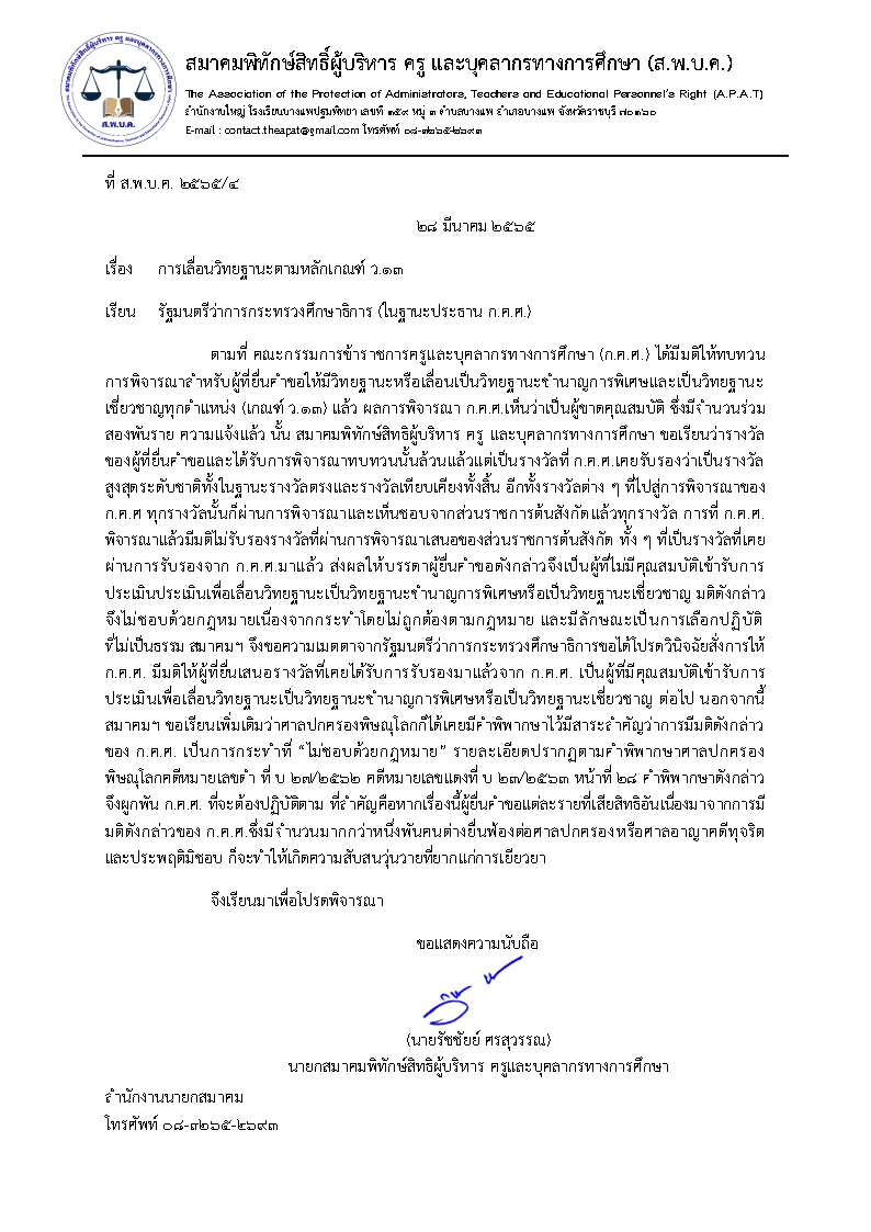 ตามที่ คณะกรรมการข้าราชการครูและบุคลากรทางการศึกษา (ก.ค.ศ.) ได้มีมติให้ทบทวนการพิจารณาสำหรับผู้ที่ยื่นคำขอให้มีวิทยฐานะหรือเลื่อนเป็นวิทยฐานะชำนาญการพิเศษและเป็นวิทยฐานะเชี่ยวชาญทุกตำแหน่ง (เกณฑ์ ว.๑๓) แล้ว ผลการพิจารณา ก.ค.ศ.เห็นว่าเป็นผู้ขาดคุณสมบัติ ซึ่งมีจำนวนร่วมสองพันราย ความแจ้งแล้ว นั้น สมาคมพิทักษ์สิทธิผู้บริหาร ครู และบุคลากรทางการศึกษา ขอเรียนว่ารางวัลของผู้ที่ยื่นคำขอและได้รับการพิจารณาทบทวนนั้นล้วนแล้วแต่เป็นรางวัลที่ ก.ค.ศ.เคยรับรองว่าเป็นรางวัลสูงสุดระดับชาติทั้งในฐานะรางวัลตรงและรางวัลเทียบเคียงทั้งสิ้น อีกทั้งรางวัลต่าง ๆ ที่ไปสู่การพิจารณาของ ก.ค.ศ ทุกรางวัลนั้นก็ผ่านการพิจารณาและเห็นชอบจากส่วนราชการต้นสังกัดแล้วทุกรางวัล การที่ ก.ค.ศ.พิจารณาแล้วมีมติไม่รับรองรางวัลที่ผ่านการพิจารณาเสนอของส่วนราชการต้นสังกัด ทั้ง ๆ ที่เป็นรางวัลที่เคยผ่านการรับรองจาก ก.ค.ศ.มาแล้ว ส่งผลให้บรรดาผู้ยื่นคำขอดังกล่าวจึงเป็นผู้ที่ไม่มีคุณสมบัติเข้ารับการประเมินประเมินเพื่อเลื่อนวิทยฐานะเป็นวิทยฐานะชำนาญการพิเศษหรือเป็นวิทยฐานะเชี่ยวชาญ มติดังกล่าวจึงไม่ชอบด้วยกฎหมายเนื่องจากกระทำโดยไม่ถูกต้องตามกฎหมาย และมีลักษณะเป็นการเลือกปฏิบัติที่ไม่เป็นธรรม สมาคมฯ จึงขอความเมตตาจากรัฐมนตรีว่าการกระทรวงศึกษาธิการขอได้โปรดวินิจฉัยสั่งการให้ ก.ค.ศ. มีมติให้ผู้ที่ยื่นเสนอรางวัลที่เคยได้รับการรับรองมาแล้วจาก ก.ค.ศ. เป็นผู้ที่มีคุณสมบัติเข้ารับการประเมินเพื่อเลื่อนวิทยฐานะเป็นวิทยฐานะชำนาญการพิเศษหรือเป็นวิทยฐานะเชี่ยวชาญ ต่อไป นอกจากนี้สมาคมฯ ขอเรียนเพิ่มเติมว่าศาลปกครองพิษณุโลกก็ได้เคยมีคำพิพากษาไว้มีสาระสำคัญว่าการมีมติดังกล่าวของ ก.ค.ศ. เป็นการกระทำที่ “ไม่ชอบด้วยกฎหมาย” รายละเอียดปรากฏตามคำพิพากษาศาลปกครองพิษณุโลกคดีหมายเลขดำ ที่ บ ๒๗/๒๕๖๒ คดีหมายเลขแดงที่ บ ๒๓/๒๕๖๓ หน้าที่ ๒๘ คำพิพากษาดังกล่าวจึงผูกพัน ก.ค.ศ. ที่จะต้องปฏิบัติตาม ที่สำคัญคือหากเรื่องนี้ผู้ยื่นคำขอแต่ละรายที่เสียสิทธิอันเนื่องมาจากการมีมติดังกล่าวของ ก.ค.ศ.ซึ่งมีจำนวนมากกว่าหนึ่งพันคนต่างยื่นฟ้องต่อศาลปกครองหรือศาลอาญาคดีทุจริต