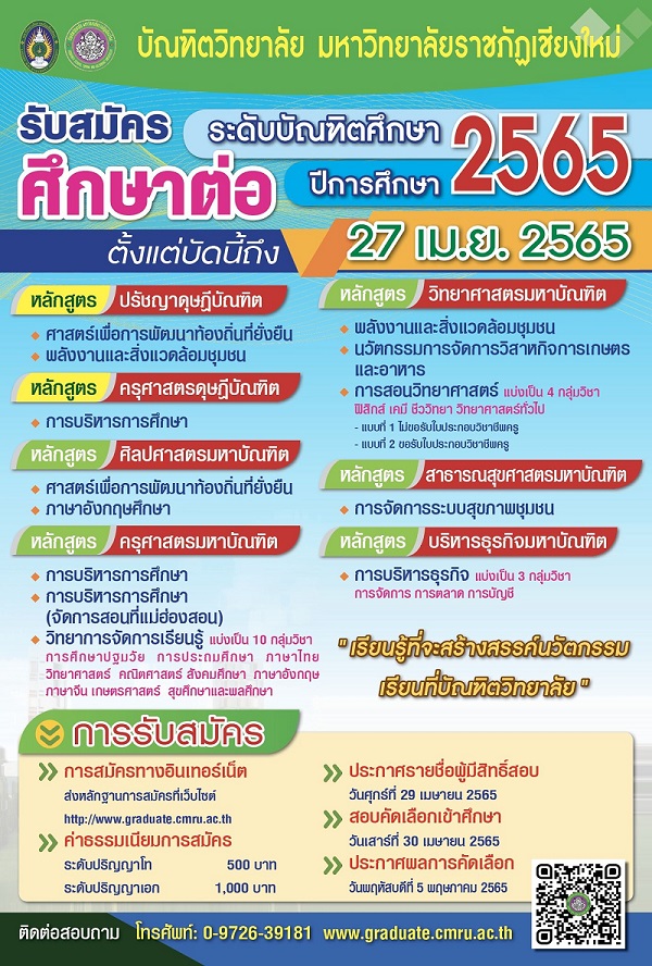 บัณฑิตวิทยาลัย มหาวิทยาลัยราชภัฏเชียงใหม่ประกาศรับสมัครนักศึกษาใหม่ ปีการศึกษา2565 รับสมัครตั้งแต่บัดนี้ถึง 27 เมษายน 2565