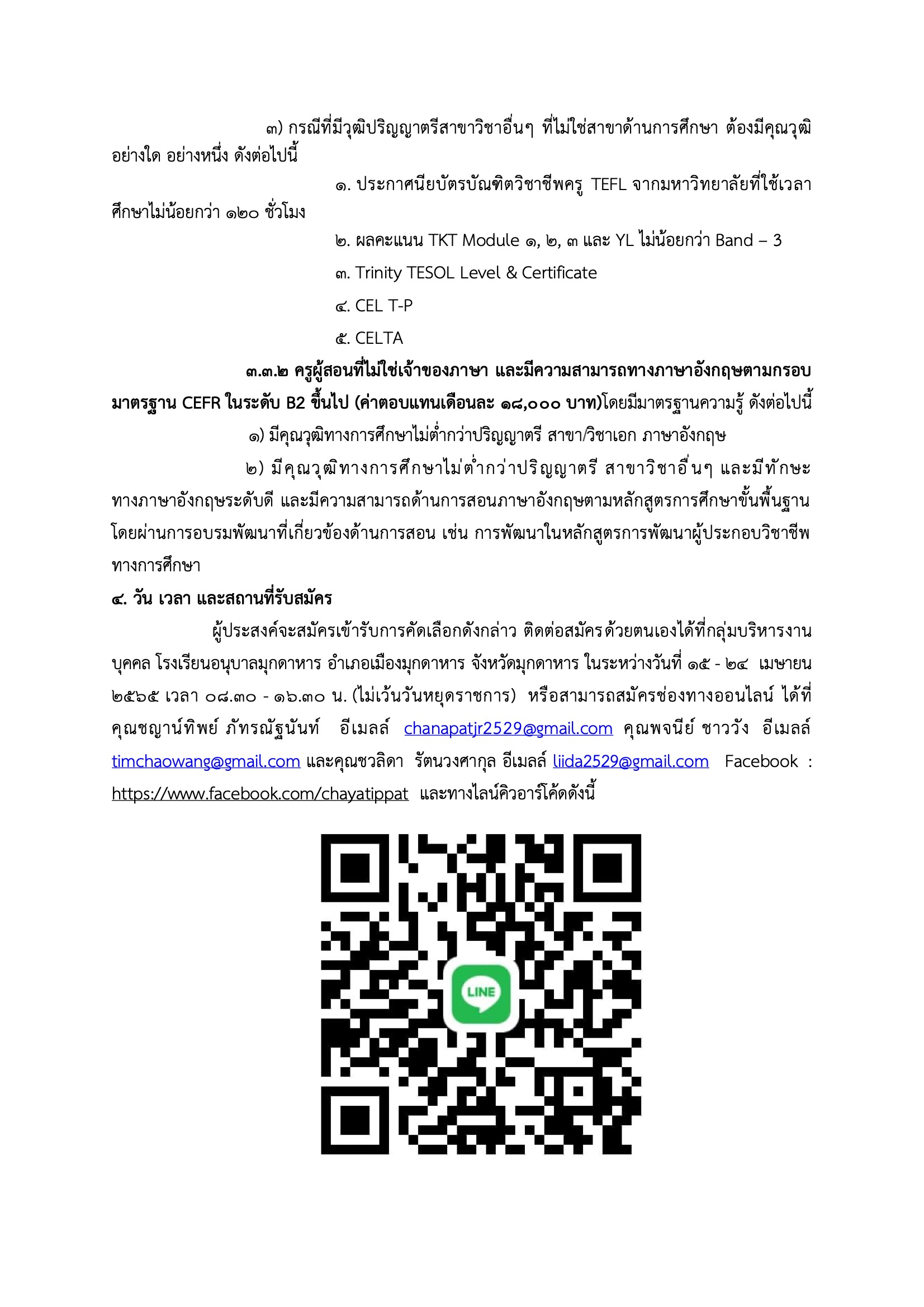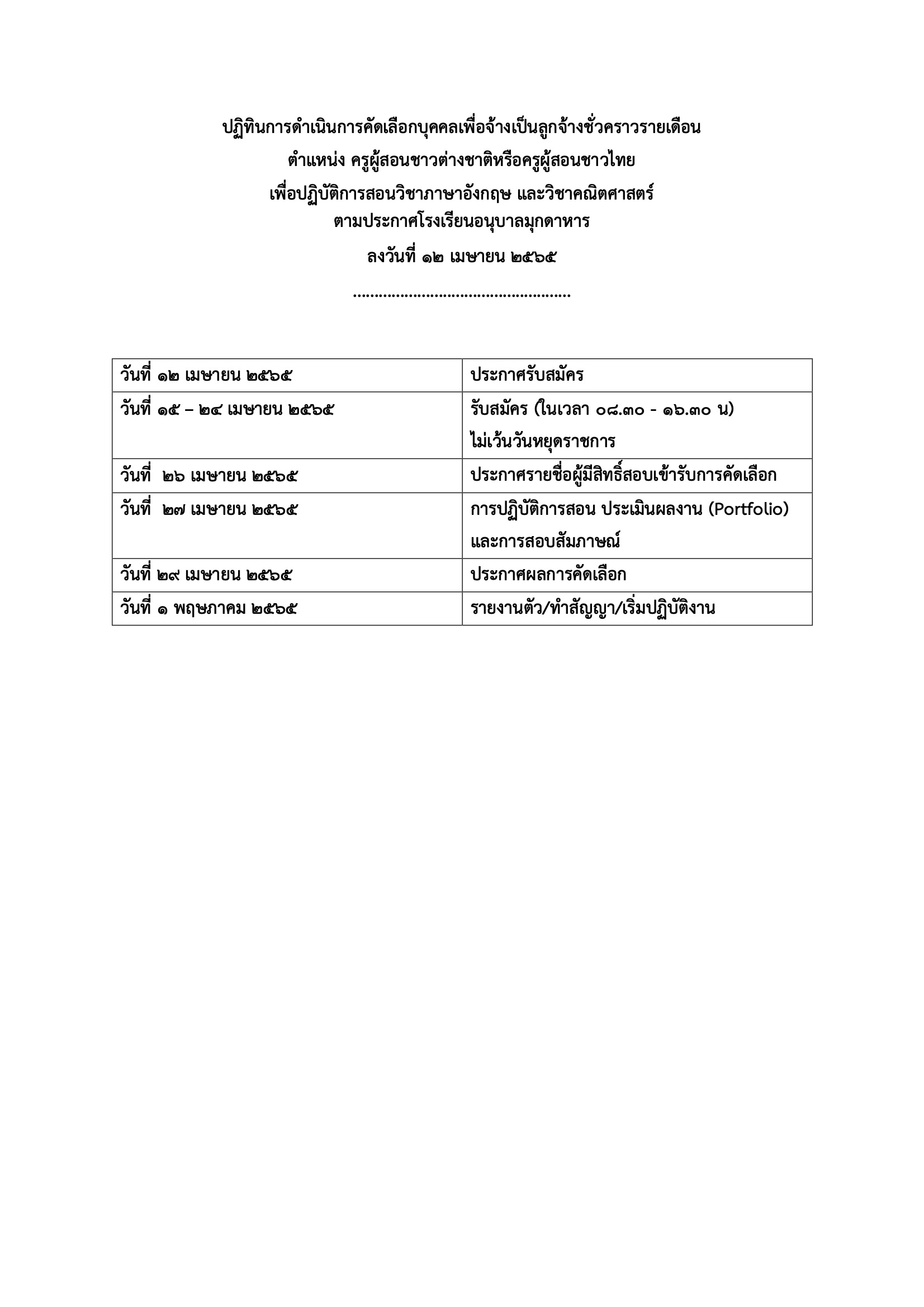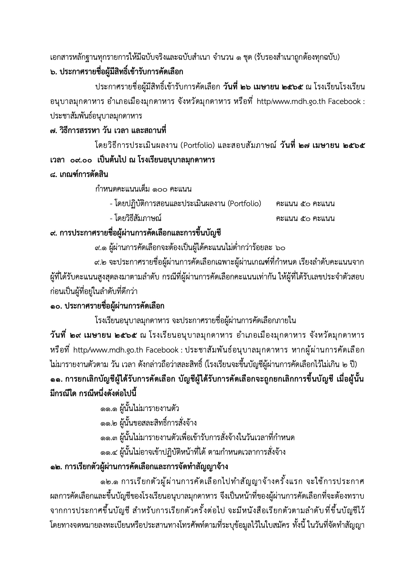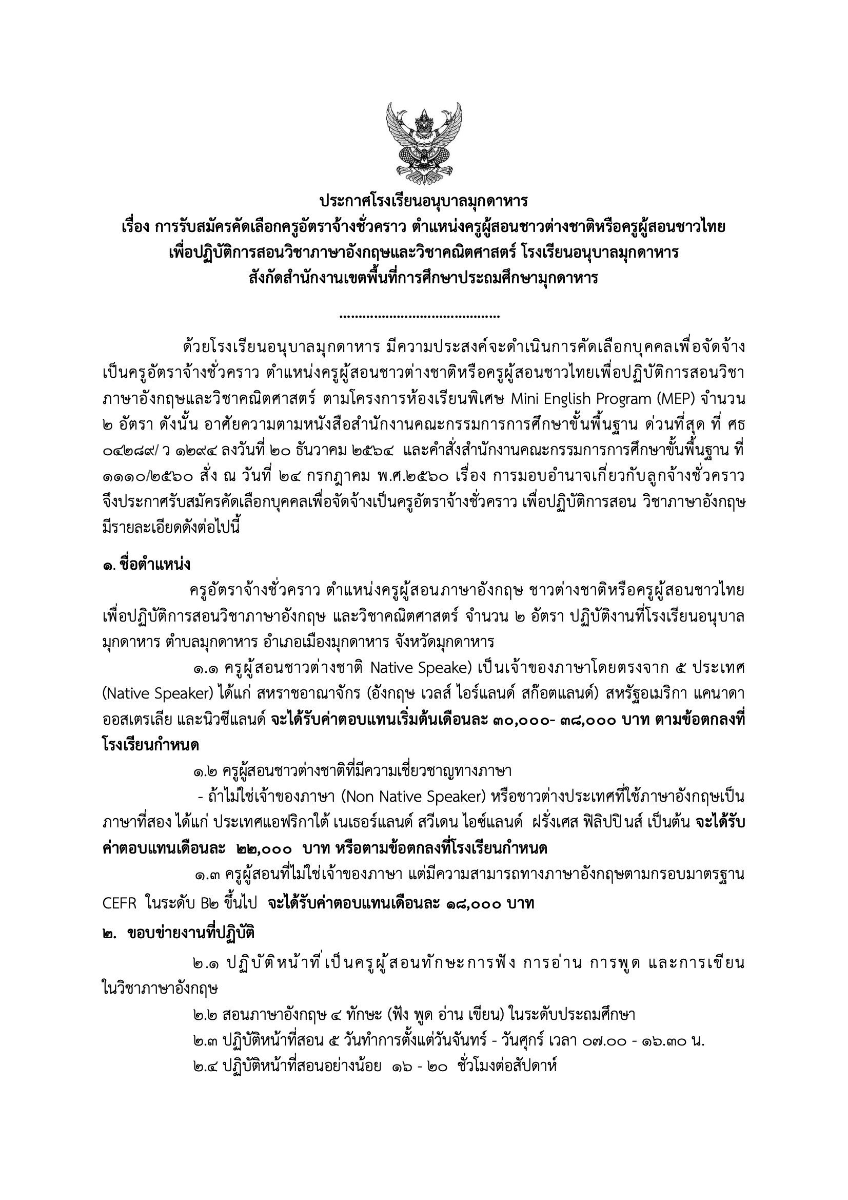 ด้วยโรงเรียนอนุบาลมุกดาหาร มีความประสงค์จะดําเนินการคัดเลือกบุคคลเพื่อจัดจ้าง เป็นครูอัตราจ้างชั่วคราว ตําแหน่งครูผู้สอนชาวต่างชาติหรือครูผู้สอนชาวไทยเพื่อปฏิบัติการสอนวิชา ภาษาอังกฤษและวิชาคณิตศาสตร์ ตามโครงการห้องเรียนพิเศษ Mini English Program (MEP) จํานวน ๒ อัตรา ดังนั้น อาศัยความตามหนังสือสํานักงานคณะกรรมการการศึกษาขั้นพื้นฐาน ด่วนที่สุด ที่ ศธ ๐๔๒๘๙/ ว ๑๒๙๔ ลงวันที่ ๒๐ ธันวาคม ๒๕๖๔ และคําสั่งสํานักงานคณะกรรมการการศึกษาขั้นพื้นฐาน ที่ ๑๑๑๐/๒๕๖๐ สั่ง ณ วันที่ ๒๔ กรกฎาคม พ.ศ.๒๕๖๐ เรื่อง การมอบอํานาจเกี่ยวกับลูกจ้างชั่วคราว จึงประกาศรับสมัครคัดเลือกบุคคลเพื่อจัดจ้างเป็นครูอัตราจ้างชั่วคราว เพื่อปฏิบัติการสอน วิชาภาษาอังกฤษ มีรายละเอียดดังต่อไปนี้
