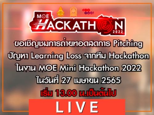 กระทรวงศึกษาธิการ สพฐ. ร่วมกับเครือข่ายครูรุ่นใหม่ ภาคเอกชนที่ให้ความสำคัญเรื่องการศึกษา และ EdTech จัดการแข่งขัน MOE Mini Hackathon 2022 ขึ้นระหว่างวันที่ 25 -27 เมษายน 2565 ณ โรงแรมรอยัล ริเวอร์ ถนนจรัญสนิทวงศ์ กรุงเทพมหานคร เพื่อเฟ้นหาหรือสร้างสรรค์นวัตกรรมสำหรับแก้ปัญหา Learning Loss ที่สามารถนำไปขยายผลการทำงานร่วมกันในอนาคต