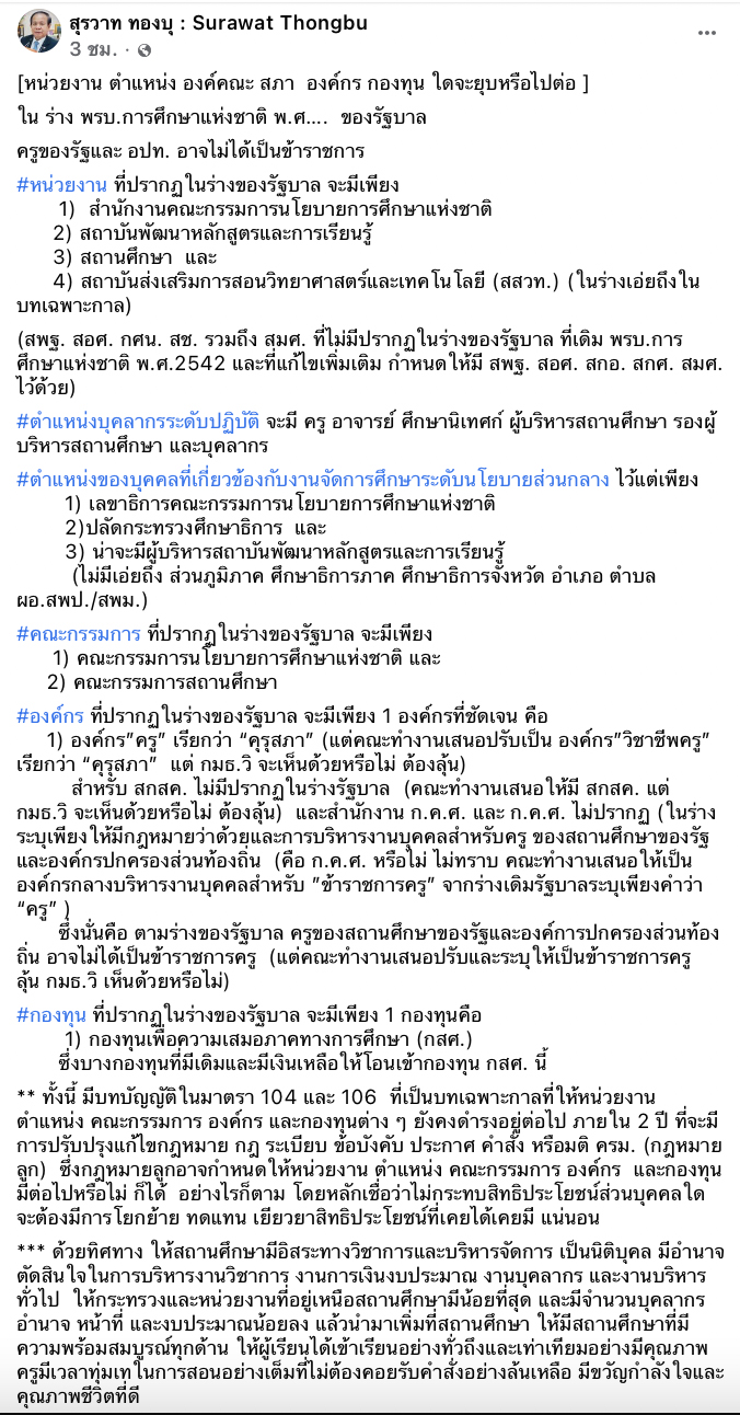 เมื่อวันที่ 29 เมษายน 2565 รศ.ดร.สุรวาท ทองบุ สมาชิกสภาผู้แทนราษฎร แบบบัญชีรายชื่อ ได้โพสต์ในเฟซบุ๊ค สุรวาท ทองบุ : Surawat Thongbu เกี่ยวกับประเด็นร้อนเกี่ยวกับการที่ที่ประชุมคณะกรรมาธิการ (กมธ.) วิสามัญพิจารณาร่าง พ.ร.บ.การศึกษาแห่งชาติ พ.ศ... มีมติเสียงข้างมากให้ยกเลิกคำสั่งหัวหน้าคณะรักษาความสงบแห่งชาติ จำนวน 5 ฉบับ ซึ่งในจำนวนดังกล่าวมีคำสั่งที่ 19/2560 เรื่องการปฏิรูปการศึกษาในภูมิภาคของกระทรวงศึกษาธิการ (ศธ.) ลงวันที่ 3 เม.ย.2560 ด้วย ซึ่งจะส่งผลถึงการยุบสำนักงานศึกษาธิการจังหวัด (ศธจ.) และสำนักงานศึกษาธิการภาค (ศธภ.) นั้น ว่าหน่วยงาน ตำแหน่ง องค์คณะ สภา องค์กร กองทุน ใดจะยุบหรือไปต่อใน ร่าง พรบ.การศึกษาแห่งชาติ พ.ศ…. ของรัฐบาล โดยมีรายละเอียด ดังนี้