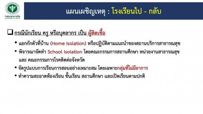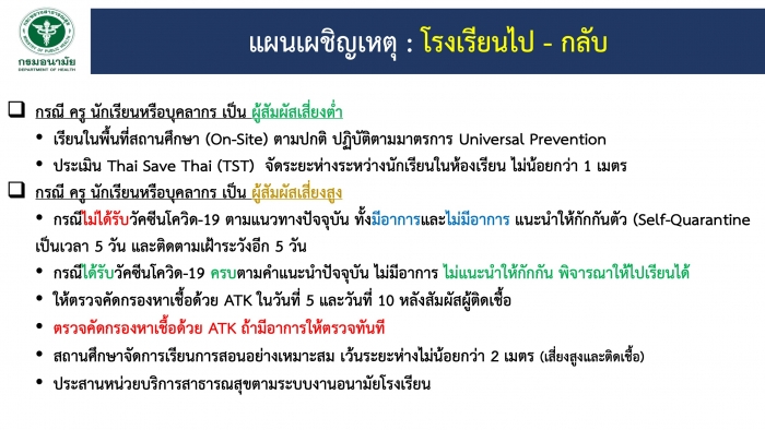 กรณีได้รับวัคซีนครบและไม่มีอาการไม่ต้องกักตัว มาเรียนได้ โดยให้ตรวจ ATK วันที่ 1, 5 และ 10 หลังสัมผัสผู้ติดเชื้อ สถานศึกษาจัดให้เรียนตามความเหมาะสม เว้นระยะห่างอย่างน้อย 2 เมตร