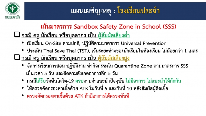 กรณีเป็นผู้สัมผัสเสี่ยงต่ำ ให้เปิดเรียนปกติ โดยป้องกันตนเองครอบจักรวาล ประเมิน Thai Save Thai (TST) เว้นระยะห่างในห้องอย่างน้อย 1 เมตร