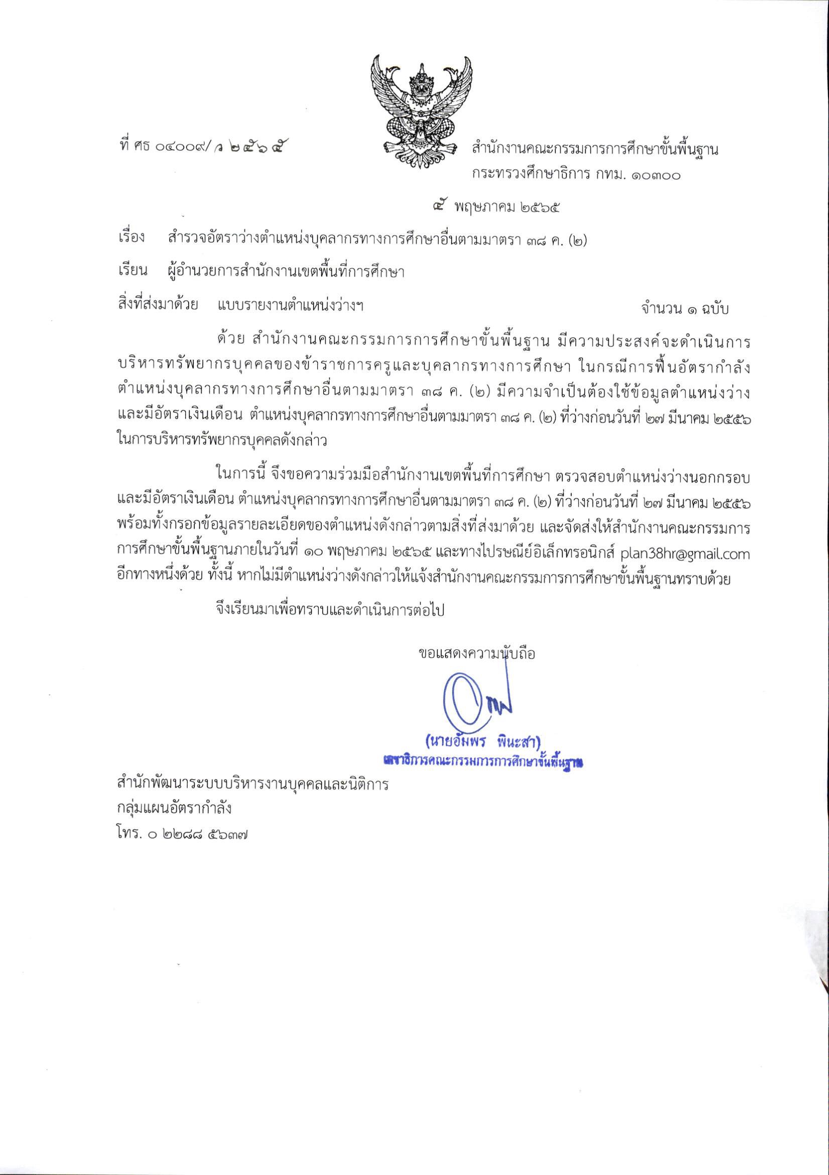 สพฐ.สำรวจอัตราว่างตำแหน่งบุคลากรทางการศึกษาอื่นตามมาตรา 38 ค. (2) (ที่ ศธ 04009/ว 2565 ลงวันที่ 5 พ.ค. 2565)