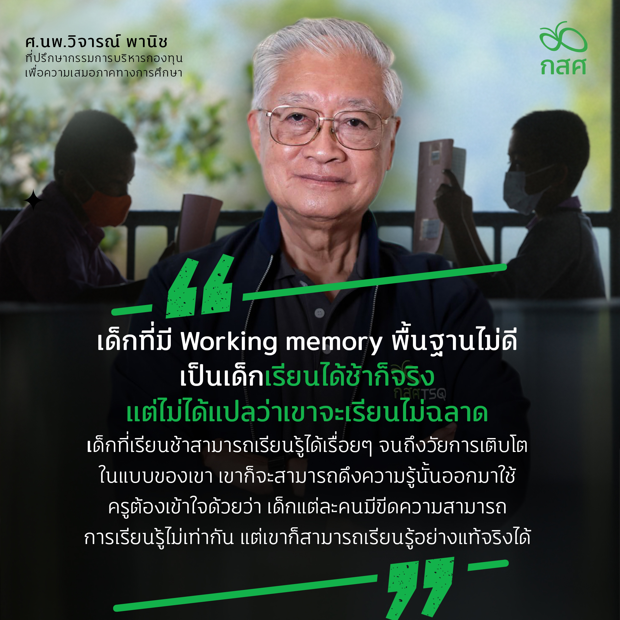 ช่วงโควิดนี้ถึงแม้จะทำให้การเรียนรู้ของเด็กมีภาวะถดถอย (learning loss) ก็จริง แต่มันยังมีแนวทางแก้ไขปัญหา คือครูต้องตระหนักว่า นักเรียนมี Working memory (ความจำที่ถูกประมวลนำมาใช้งาน) ไม่เท่ากัน มีความสามารถการจดจำการเรียนต่างกัน อย่างไรก็ตามเด็กที่มี Working memory พื้นฐานไม่ดี เป็นเด็กที่เรียนได้ช้าก็จริง แต่ไม่ได้แปลว่าเขาจะเรียนไม่ฉลาด เด็กที่เรียนช้าสามารถเรียนรู้ได้เรื่อยๆ จนถึงวัยการเติบโตในแบบของเขา เขาก็จะสามารถดึงความรู้นั้นออกมาใช้ และก็เคยมีเคสที่ประสบความสำเร็จมาแล้วด้วย ครูต้องเข้าใจด้วยว่า เด็กแต่ละคนมีขีดความสามารถการเรียนรู้ไม่เท่ากัน แต่เขาก็สามารถเรียนรู้อย่างแท้จริงได้