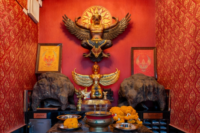 เพราะคนโบราณเชื่อว่าการสักการะหรือกราบองค์พญาครุฑ จะเสริมอำนาจ บารมีทางการค้า ติดต่อเจรจาทางการก็ดี
