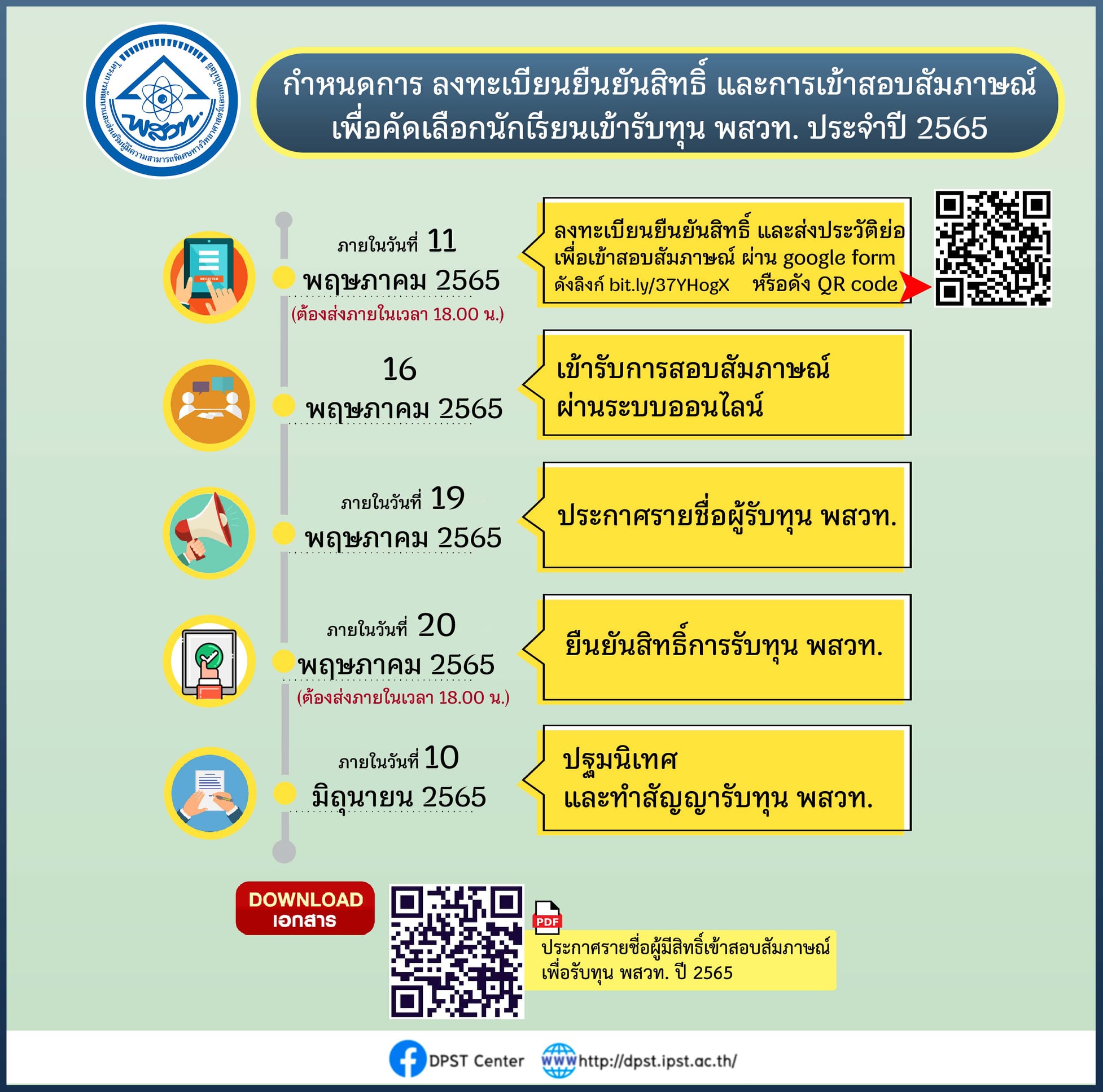 สอบถามและดูรายละเอียดได้ที่ Facebook DPST Center : https://www.facebook.com/dpstcenter/ ,เว็บไซต์ : http://dpst.ipst.ac.th/ หรือ โทร. 0 2392 4021 ต่อ 2308 – 2315 และ 7604 – 7608 (ฝ่าย พสวท.)