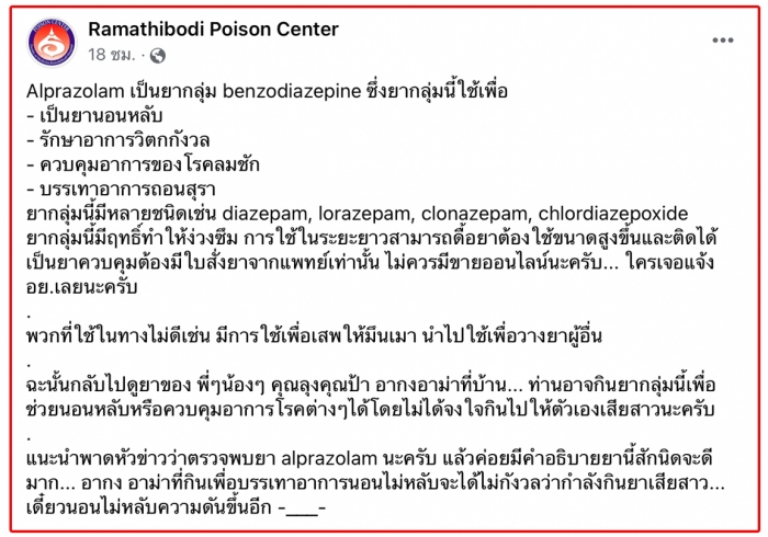 แนะนำพาดหัวข่าวว่าตรวจพบยา alprazolam นะครับ แล้วค่อยมีคำอธิบายยานี้สักนิดจะดีมาก... อากง อาม่าที่กินเพื่อบรรเทาอาการนอนไม่หลับจะได้ไม่กังวลว่ากำลังกินยาเสียสาว... เดี๋ยวนอนไม่หลับความดันขึ้นอีก -___-