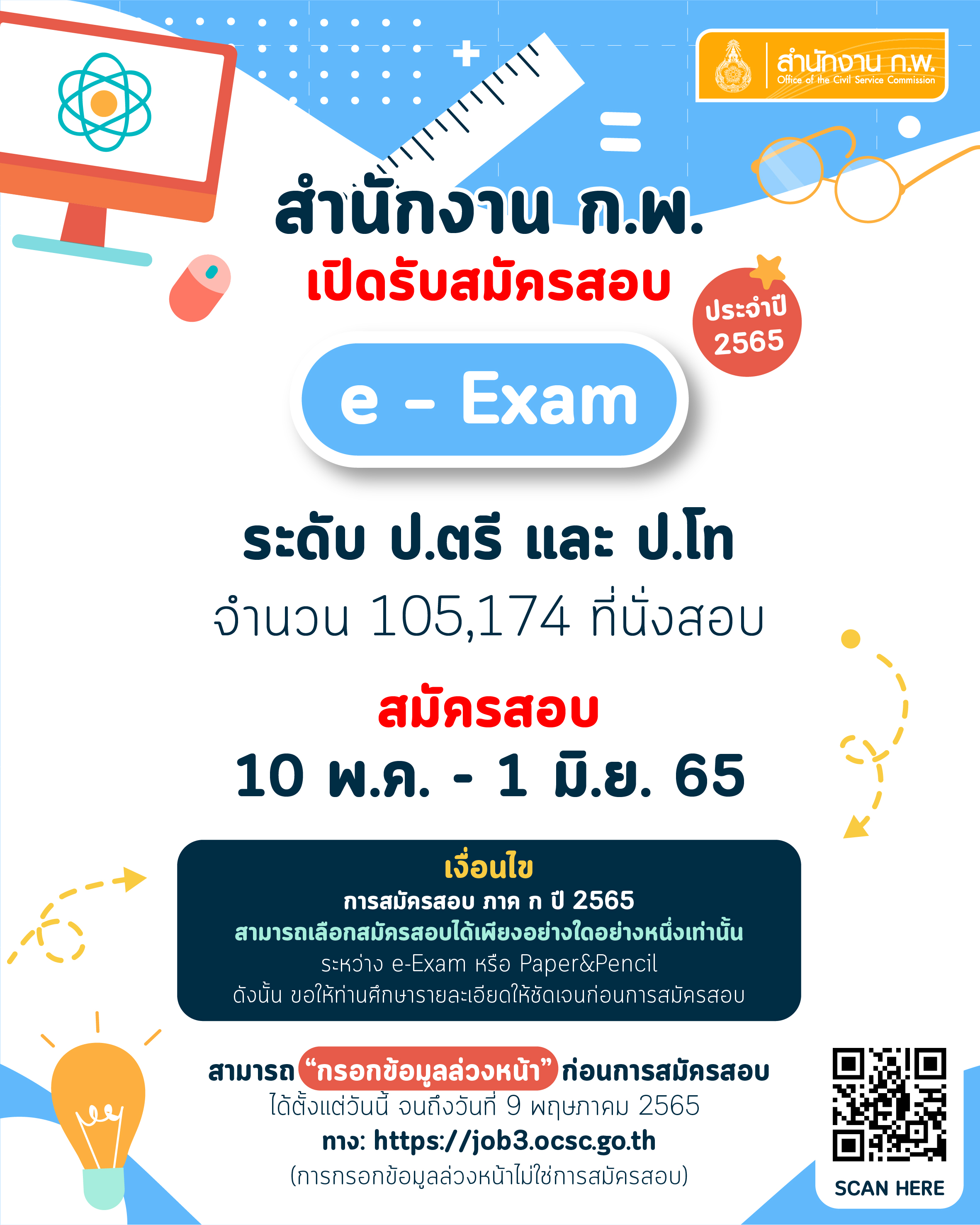 ทั้งนี้ ท่านสามารถ “กรอกข้อมูลล่วงหน้า” ก่อนการสมัครสอบภาค ก ปี 2565 แบบ e-Exam ได้ถึงวันนี้! (วันที่ 9 พฤษภาคม 2565) ทางเว็บไซต์: