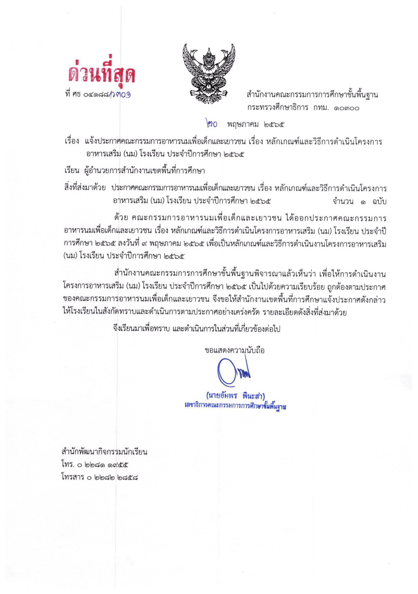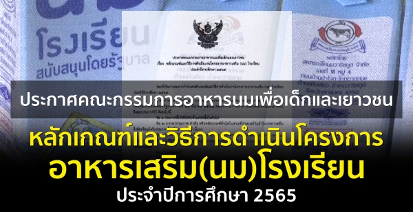 ประกาศคณะกรรมการอาหารนมเพื่อเด็กและเยาวชน เรื่อง หลักเกณฑ์และวิธีการดำเนินโครงการอาหารเสริม(นม) โรงเรียน ประจำปีการศึกษา 2565