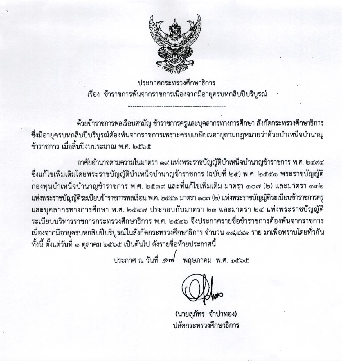 อาศัยอำนาจตามความในมาตรา ๑๙ แห่งพระราชบัญญัติบำเหน็จบำนาญข้าราชการ พ.ศ. ๒๔๙๔ ซึ่งแก้ไขเพิ่มเติมโดยพระราชบัญญัติบำเหน็จบำนาญข้าราชการ (ฉบับที่ ๒๕) พ.ศ. ๒๕๕๑ พระราชบัญญัติ กองทุนบำเหน็จบำนาญข้าราชการ พ.ศ. ๒๕๓๙ และที่แก้ไขเพิ่มเติม มาตรา ๑๐๗ (๒) และมาตรา ๑๓๒ แห่งพระราชบัญญัติระเบียบข้าราชการพลเรือน พ.ศ. ๒๕๕๑ มาตรา ๑๐๗ (๒ แห่งพระราชบัญญัติระเบียบข้าราชการครู และบุคลากรทางการศึกษา พ.ศ. ๒๕๔๗ ประกอบกับมาตรา ๒๓ และมาตรา ๒๔ แห่งพระราชบัญญัติ ระเบียบบริหารราชการกระทรวงศึกษาธิการ พ.ศ. ๒๕๔๖ จึงประกาศรายชื่อข้าราชการต้องพ้นจากราชการ เนื่องจากมีอายุครบหกสิบบีบริบูรณ์ในสังกัดกระทรวงศึกษาธิการ จำนวน ๑๘,.๔๔๑ ราย มาเพื่อทราบโดยทั่วกัน ทั้งนี้ ตั้งแต่วันที่ ๑ ตุลาคม ๒๕๖๕ เป็นต้นไป ดังรายชื่อท้ายประกาศนี้