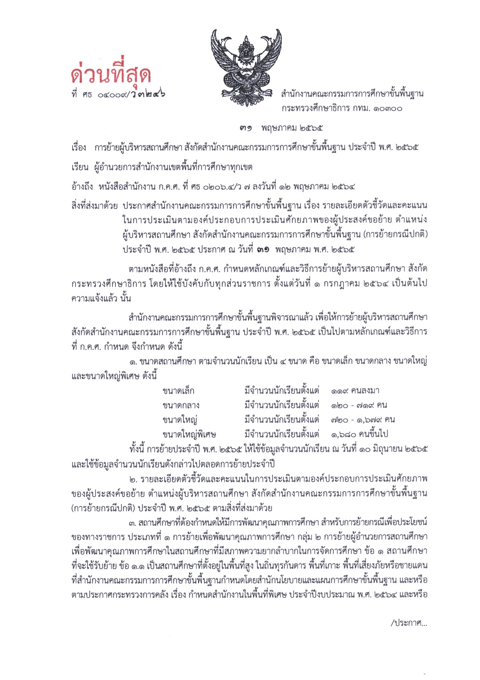 การย้ายผู้บริหารสถานศึกษา สังกัดสำนักงานคณะกรรมการการศึกษาขั้นพื้นฐาน ประจำปี พ.ศ. ๒๕๖๕