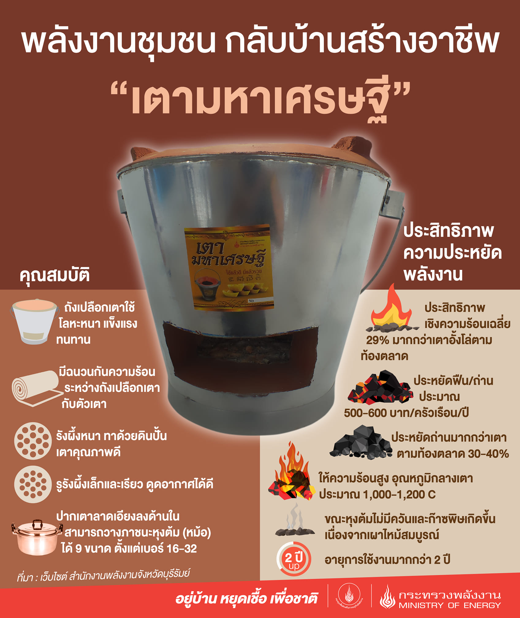 จากปัญหาราคาพลังงานเชื้อเพลิงที่กำลังพุ่งสูงขึ้นอย่างต่อเนื่อง สวนทางกับรายได้ และเศรษฐกิจของประเทศไทยที่กำลังอยู่ในภาวะถดถอยในขณะนี้นั้น ส่งผลให้รัฐบาลพยายามหาทางออก แนวทางต่าง ๆ เข้ามาช่วยบรรเทาความเดือดร้อนให้แก่ประชาชน โดยเฉพาะการลดภาระค่าใช้จ่ายด้านพลังงานเชื้อเพลิง ที่ล่าสุดกรมพัฒนาพลังงานทดแทนและอนุรักษ์พลังงาน (พพ.) ได้เปิดตัว "เตามหาเศรษฐี" หรือ เตาอั้งโล่ ประหยัดถ่าน พร้อมทั้งแนะนำให้ประชาชนหันมาใช้ เตาอั้งโล่มหาเศรษฐี แทนเพราะประหยัดถ่านได้มากกว่าเตาอั้งโล่ทั่ว ๆ ไป มากถึง 40 %