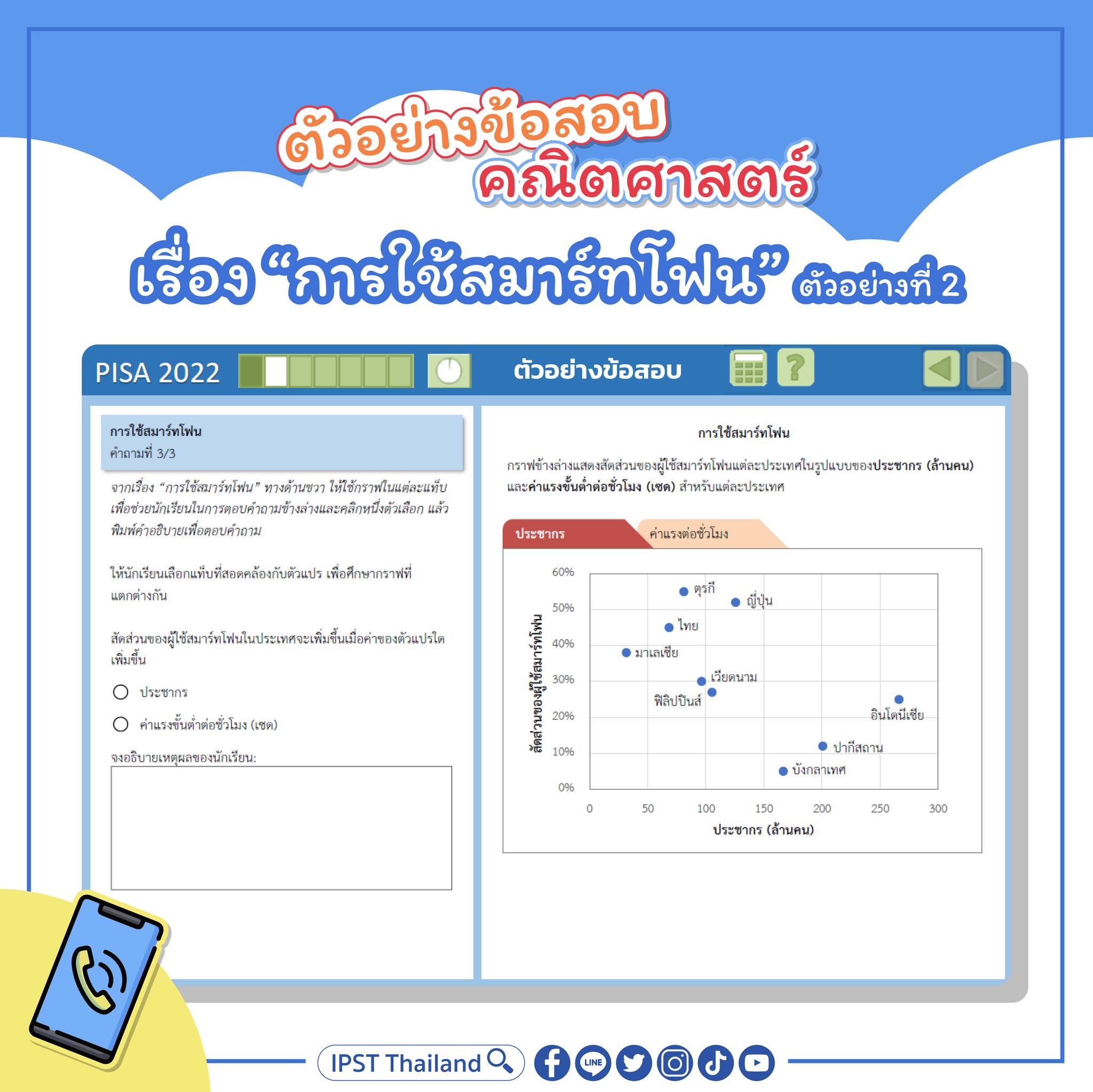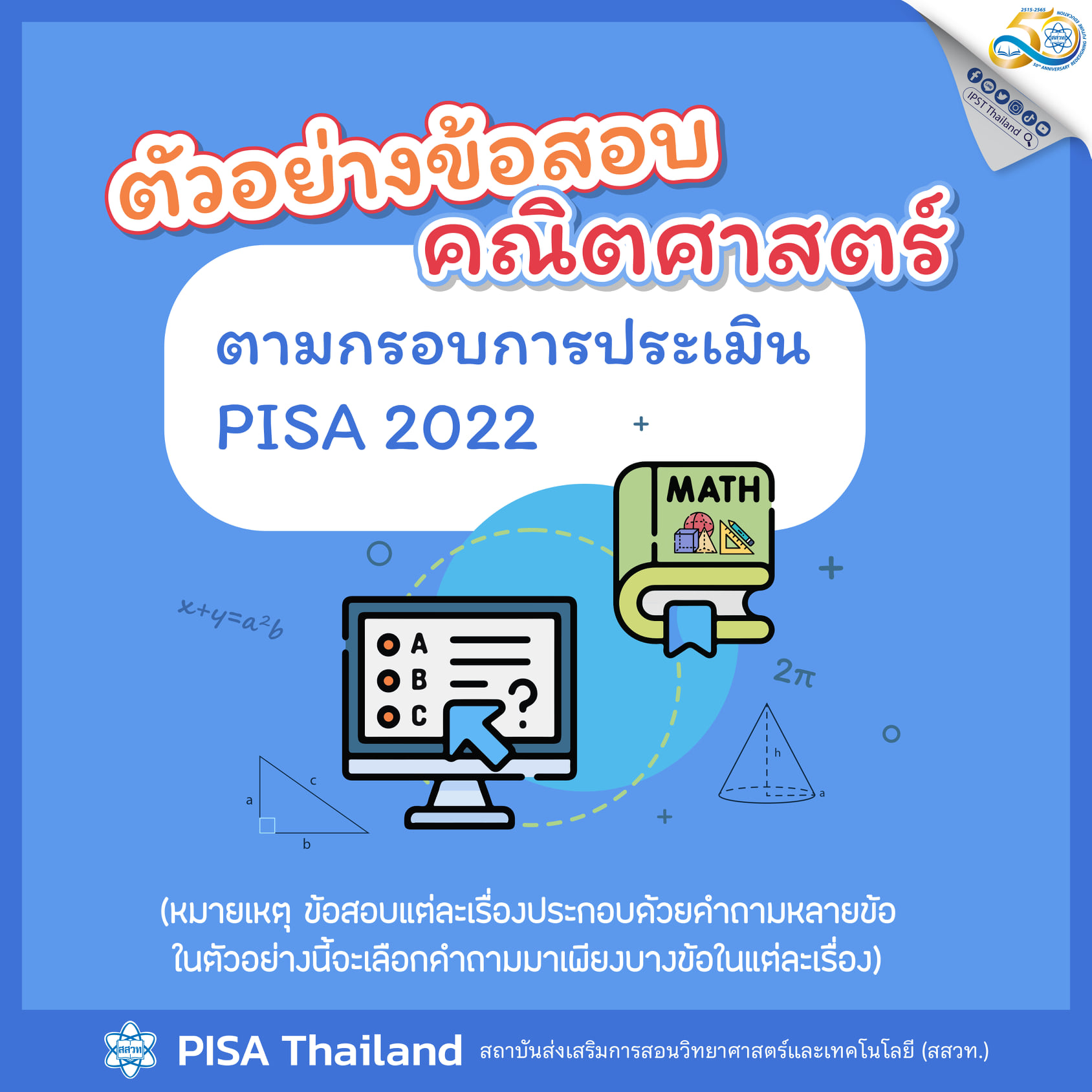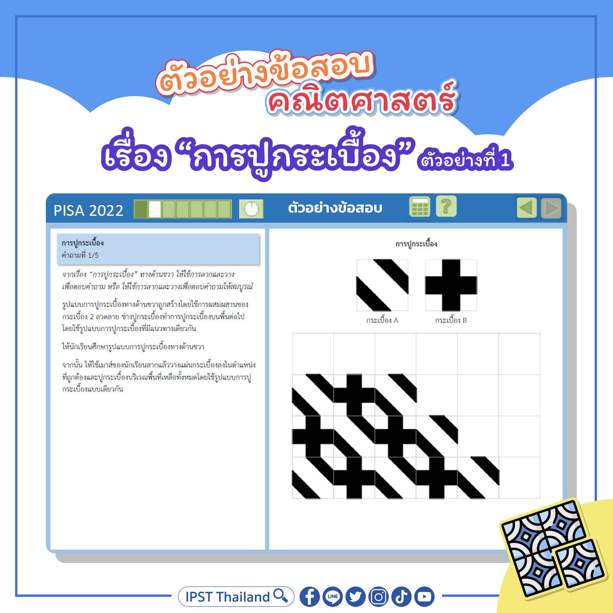 Facebook: IPST Thailand ได้จัดทำ Infographics นำเสนอตัวอย่างข้อสอบคณิตศาสตร์ตามกรอบการประเมิน PISA 2022 ที่ OECD เผยแพร่ทาง https://pisa2022-maths.oecd.org/files/PISA%202022%20Mathematics%20Framework%20Draft.pdf