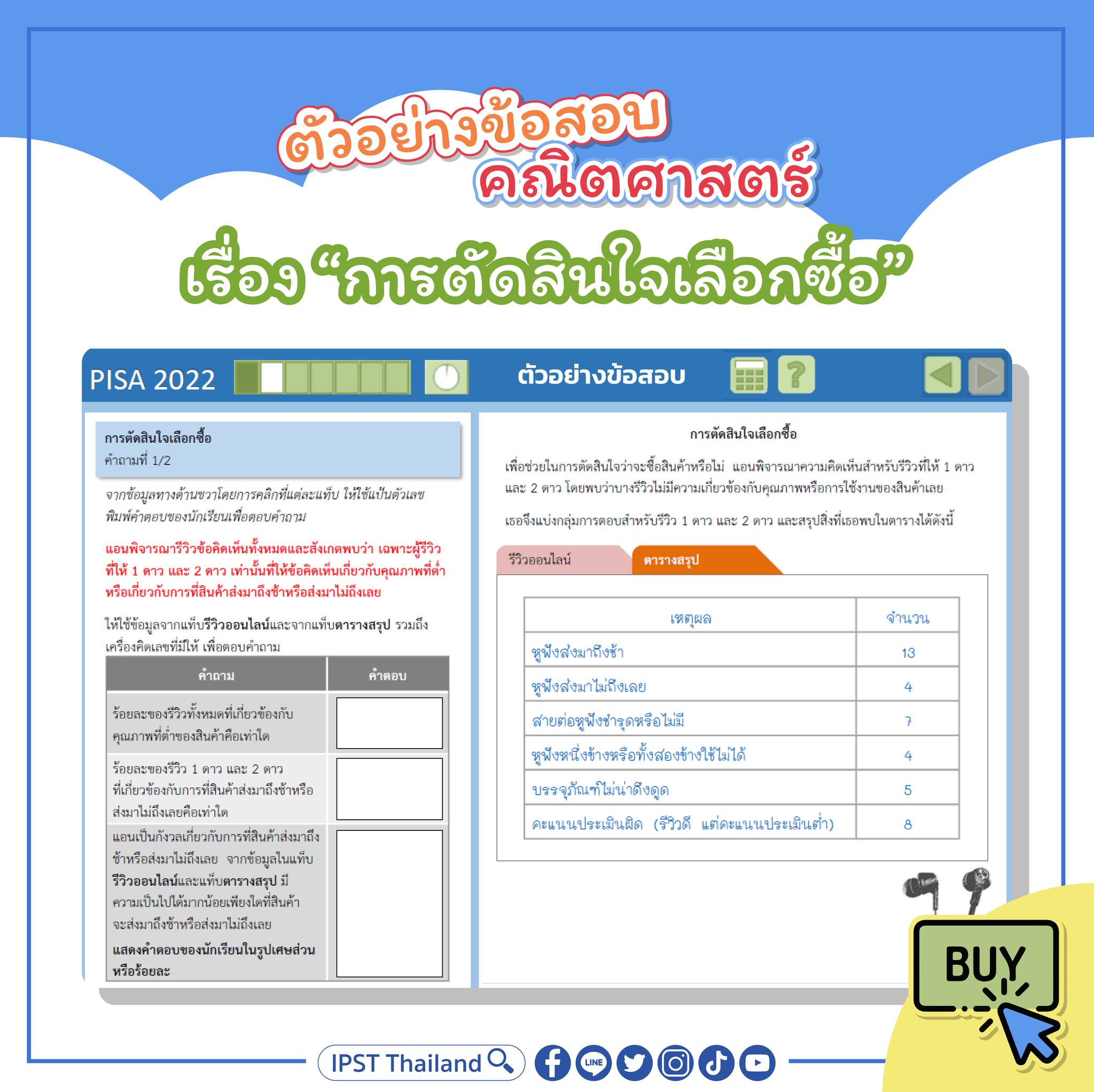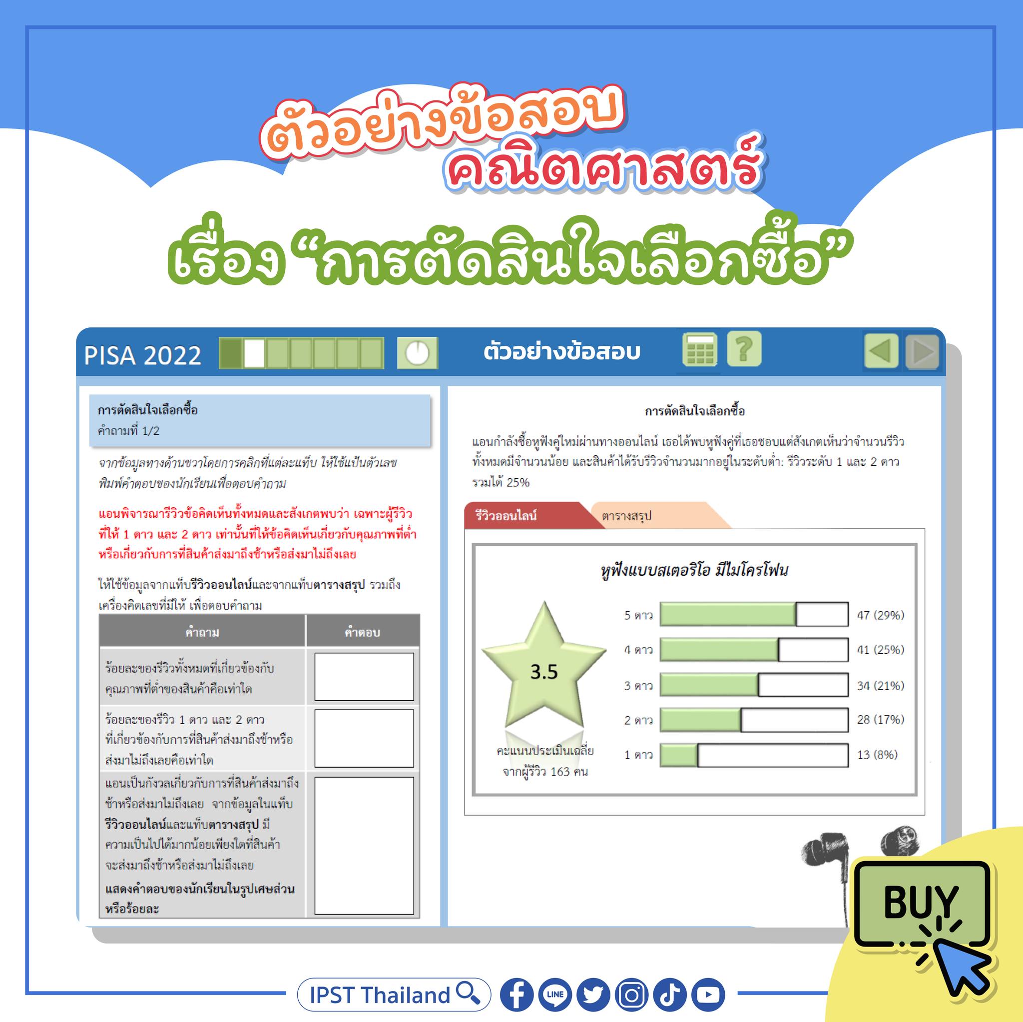 ข้อสอบข้อนี้เป็นตัวอย่างของสถานการณ์การเลือกซื้อของผ่านทางออนไลน์ ซึ่งมีรีวิวของผู้ที่เคยซื้อสินค้าชิ้นเดียวกันนี้ไปแล้ว โดยนักเรียนต้องใช้ข้อมูลจากแท็บข้อมูลรีวิวที่แสดงถึงระดับความพึงพอใจและแท็บตารางสรุปที่เกี่ยวข้องกับคุณภาพสินค้าและการใช้งานสินค้า