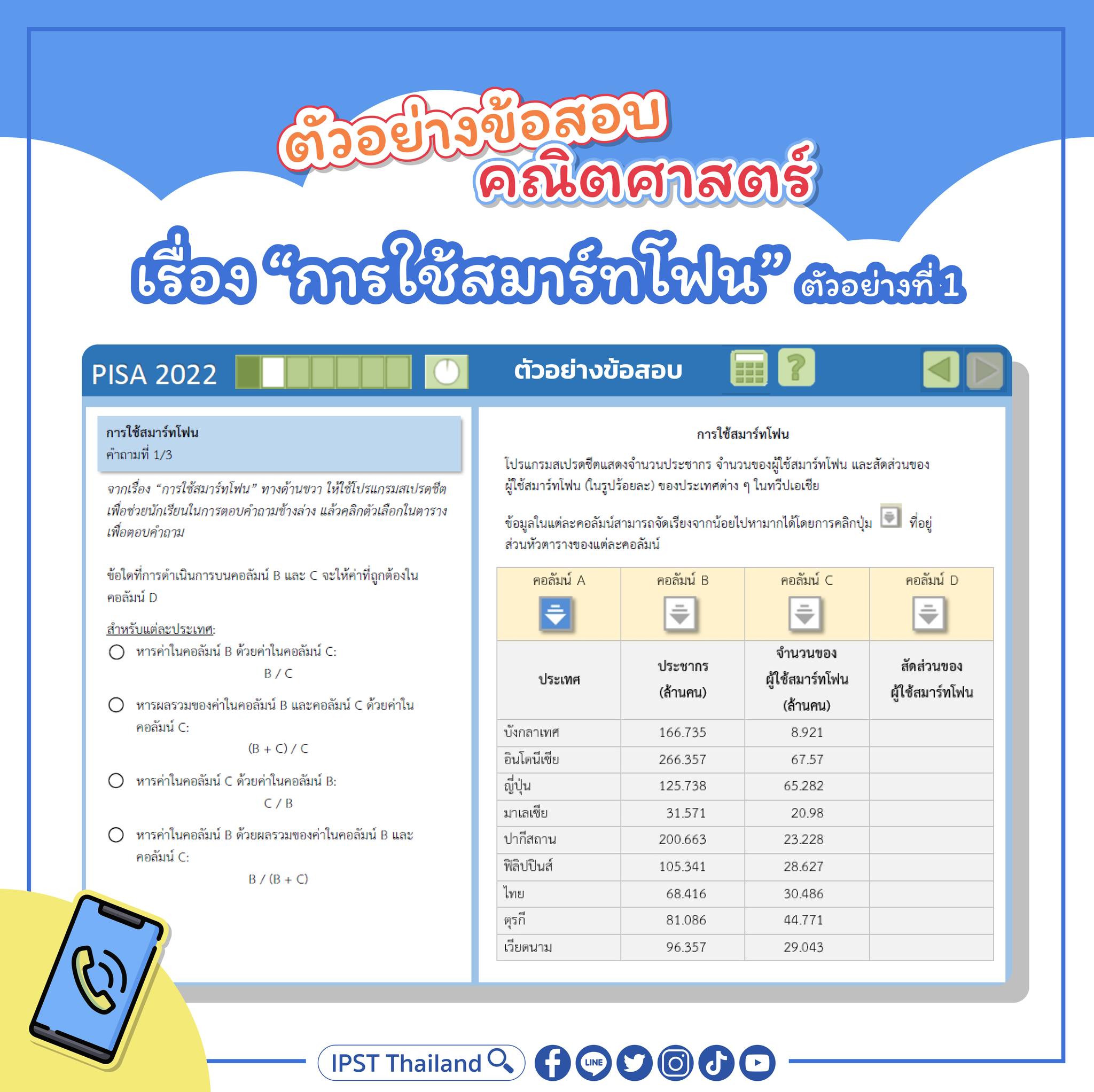 โดยในตัวอย่างที่ 1 ในสถานการณ์เรื่อง “การใช้สมาร์ทโฟน” นักเรียนจะได้พิจารณาข้อมูลเปรียบเทียบของจำนวนประชากรและจำนวนผู้ใช้สมาร์ทโฟนในประเทศต่าง ๆ และต้องหาว่าจะคำนวณสัดส่วนของผู้ใช้สมาร์ทโฟนได้อย่างไร โดยให้ระบุคำตอบในรูปของการดำเนินการกับชุดข้อมูล แต่ไม่ต้องลงมือคำนวณหาผลลัพธ์