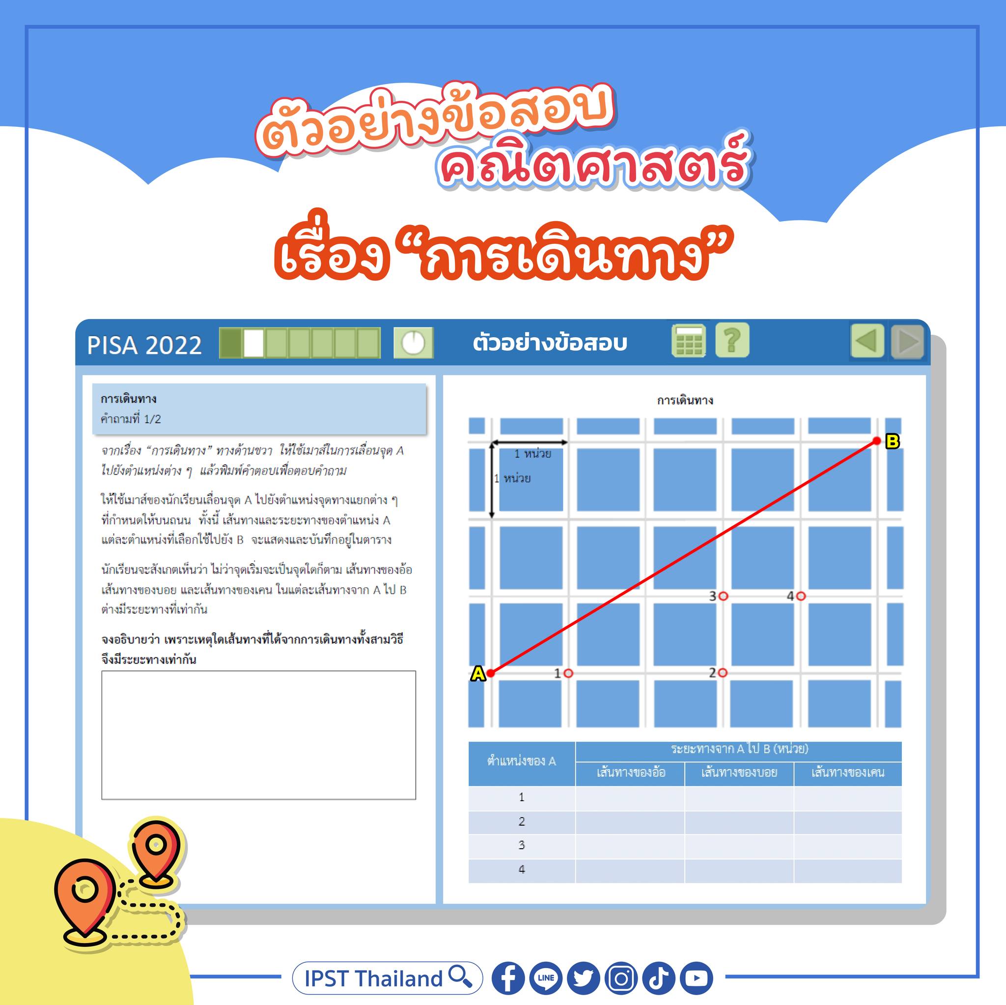ข้อสอบข้อนี้ นักเรียนจะได้ทดลองเลื่อนจุดเริ่มต้น (จุด A) ไปไว้ที่ตำแหน่งต่าง ๆ กัน จากนั้นโปรแกรมจะคำนวณและแสดงระยะทางจากจุด A ไปจุด B สำหรับการเดินทางทั้งสามวิธีให้ในตาราง นักเรียนจะต้องใช้เหตุผลในการอธิบายว่าเพราะเหตุใดการเดินทางทั้งสามวิธีจึงมีระยะทางเท่ากันเสมอ