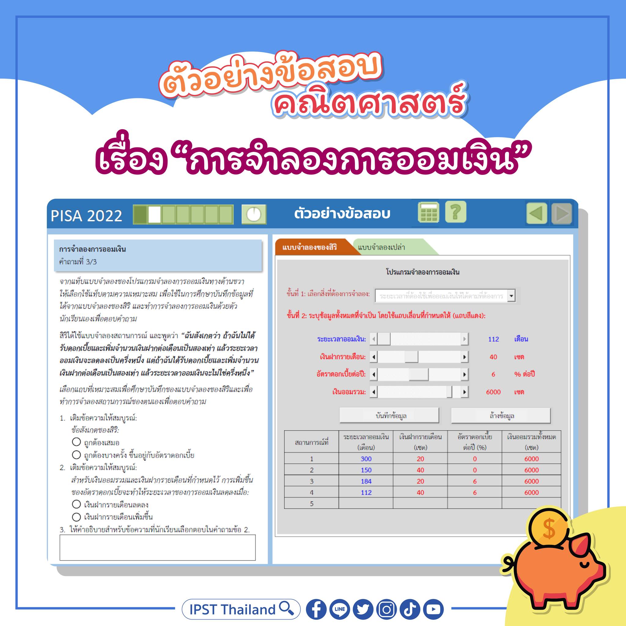 ข้อสอบข้อนี้เป็นตัวอย่างของโปรแกรมสถานการณ์จำลองการคำนวณเกี่ยวกับการออมเงิน โดยมีตัวแปรที่เกี่ยวข้อง 4 ตัวแปร ได้แก่ ระยะเวลาออมเงิน เงินฝากรายเดือน อัตราดอกเบี้ยต่อปี และเงินออมรวม
